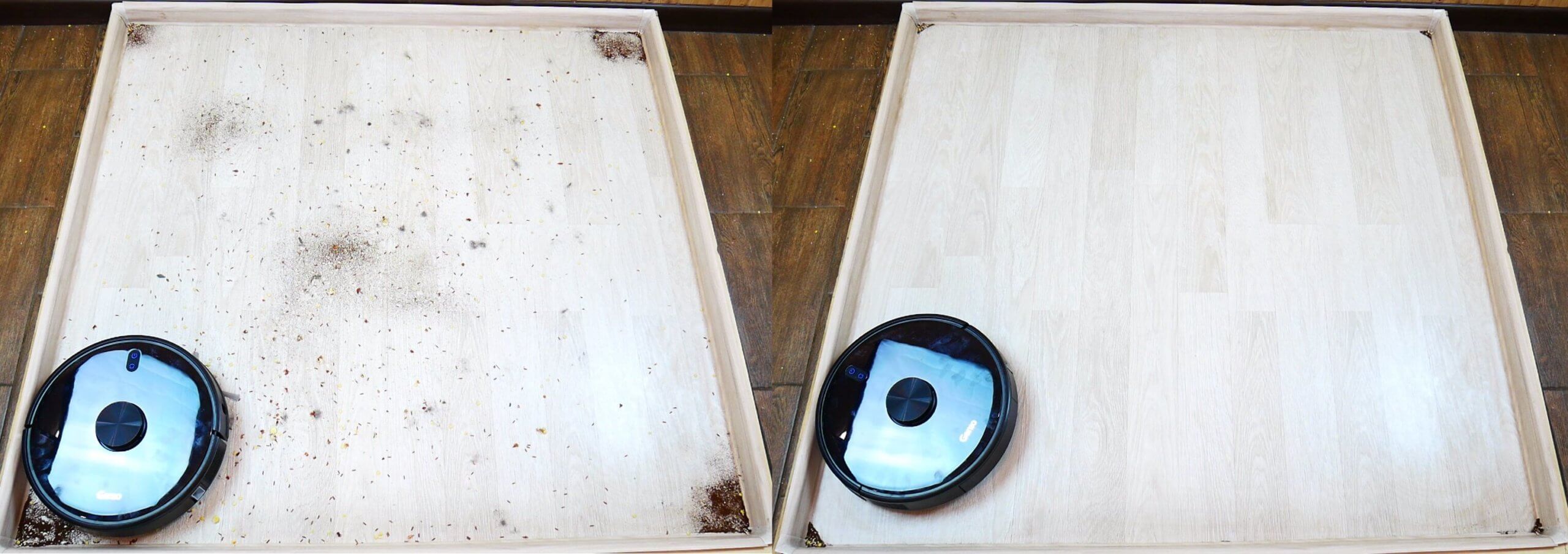 Robotas dulkių siurblys surinko beveik visas šiukšles, dalį palikdamas kampuose, tačiau tai yra universalių robotų dulkių siurblių problema. Plaukai ir kailis įstrigdavo šepečiuose, tačiau didžioji dalis šiukšlių atsidūrė dulkių konteineryje. Bandymas buvo sėkmingas.