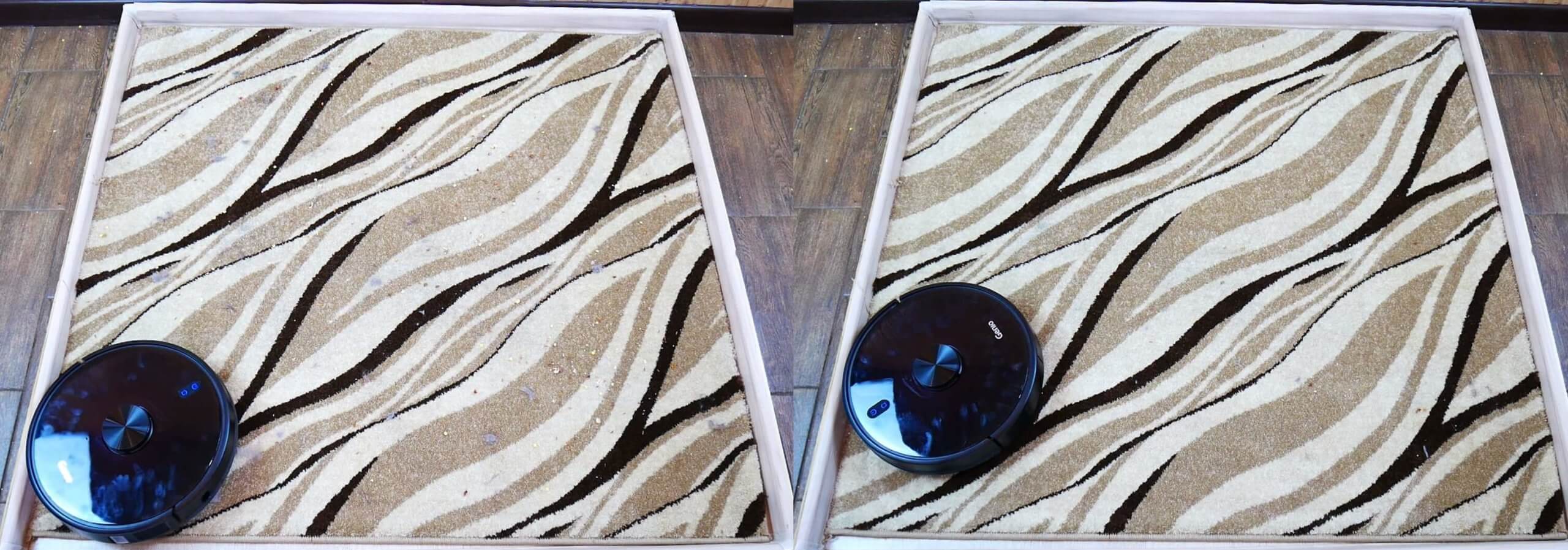 „Genio Laser L800“ šiek tiek prasčiau valė kilimus. Jis surinko didžiąją dalį šiukšlių, tačiau liko plaukų, pūkų ir grūdų. Kilimų valymo efektyvumas buvo didesnis nei vidutinis, bet ne puikus.