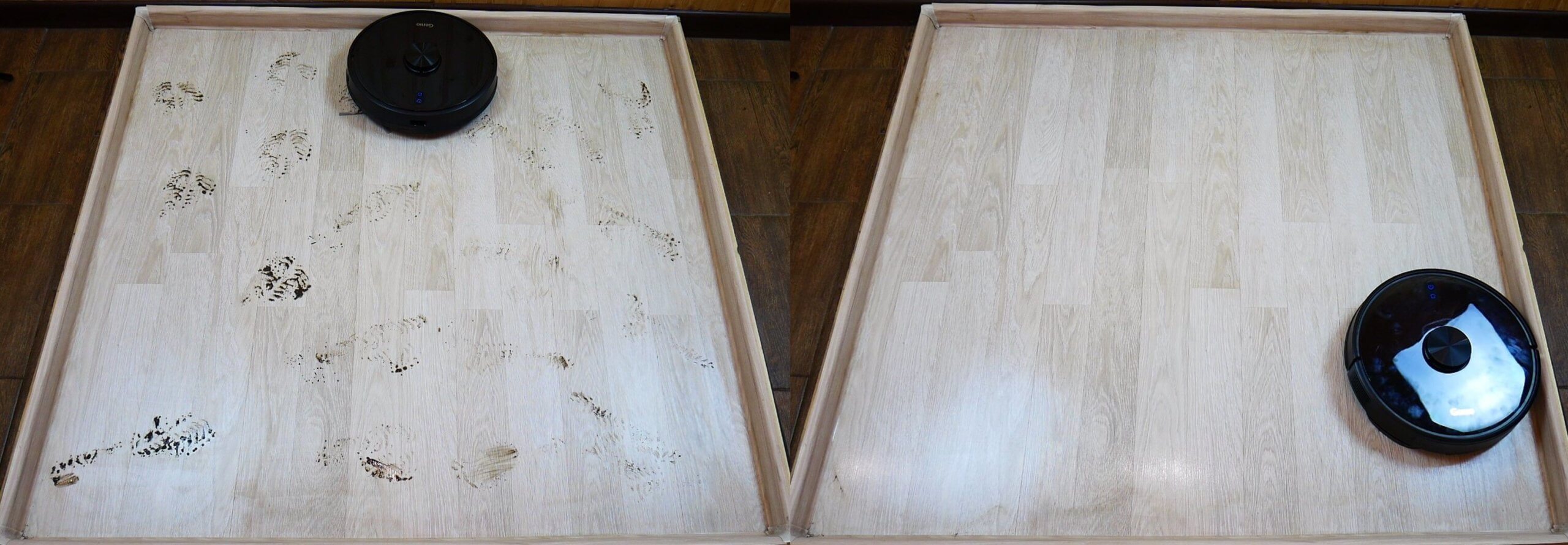 Taip, didžioji dalis nešvarumų buvo pašalinta, tačiau kampuose vis dar buvo likę dryžių ir nebaigtų valyti vietų. Kaip ir kilimo atveju, valymo kokybė buvo aukštesnė nei vidutinė, bet ne ideali. Tačiau verta paminėti, kad šluostė tvirtai prispaudė prie grindų.