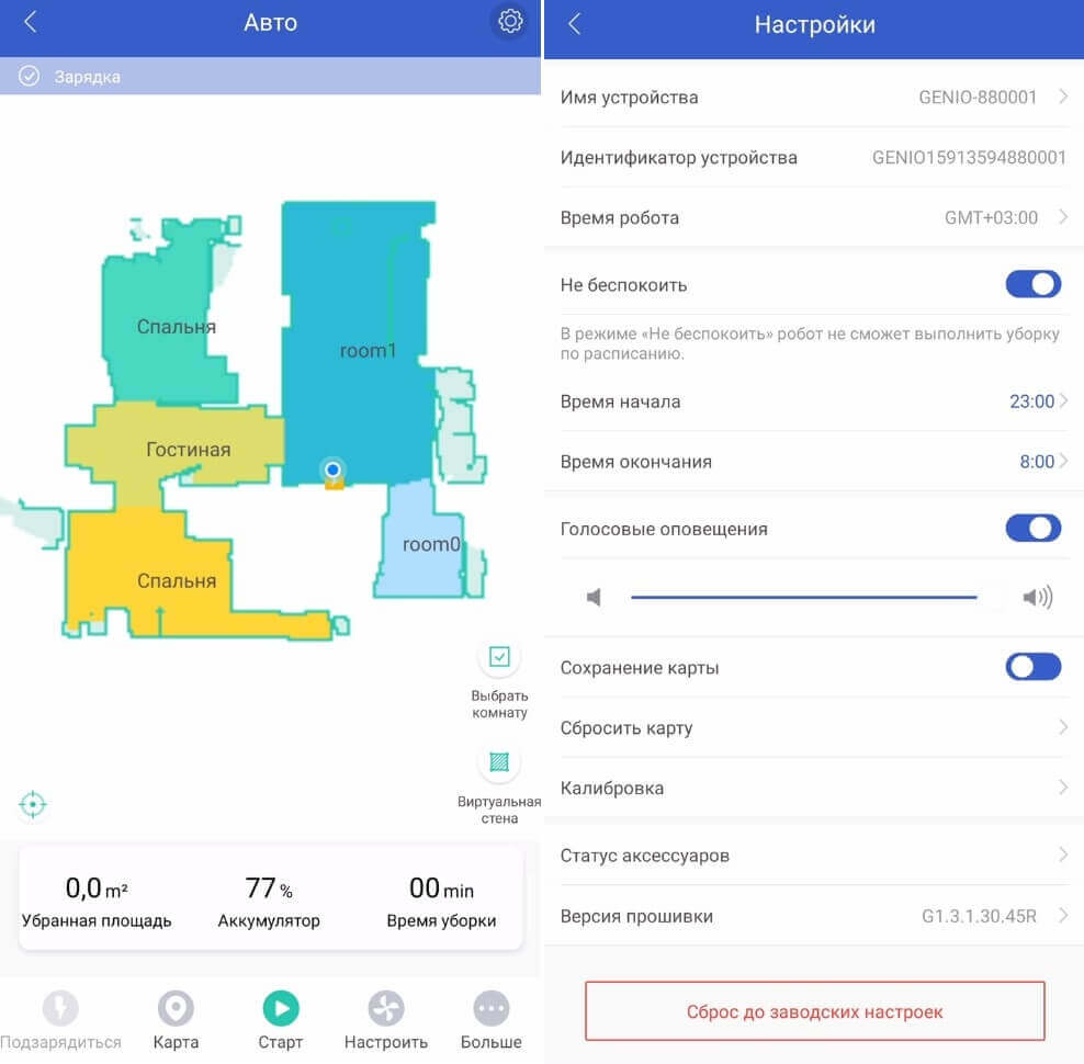 Taigi, žemėlapis yra tikslus, o robotas automatiškai suskirsto jį į kambarius – tai yra privalumas. Nustatymuose yra režimas „netrukdyti“, galima įjungti ir išjungti balso įspėjimus, reguliuoti jų garsumą. Beje, „Genio Laser L800“ kalba rusiškai.