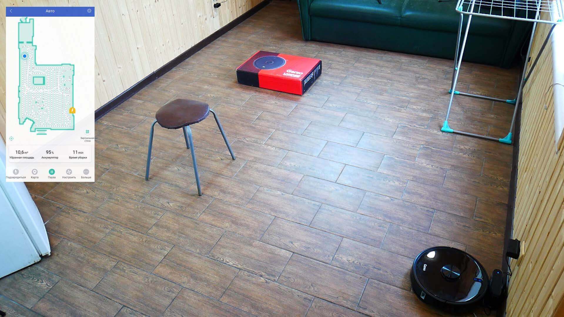 Robotas be jokių problemų prisijungia prie tinklo, o programėlė yra rusų kalba. Atlikome bandomąjį paleidimą, kad padėtume robotui sudaryti kambario žemėlapį ir išsaugoti jį savo atmintyje. Po to visos funkcijos tampa prieinamos.
