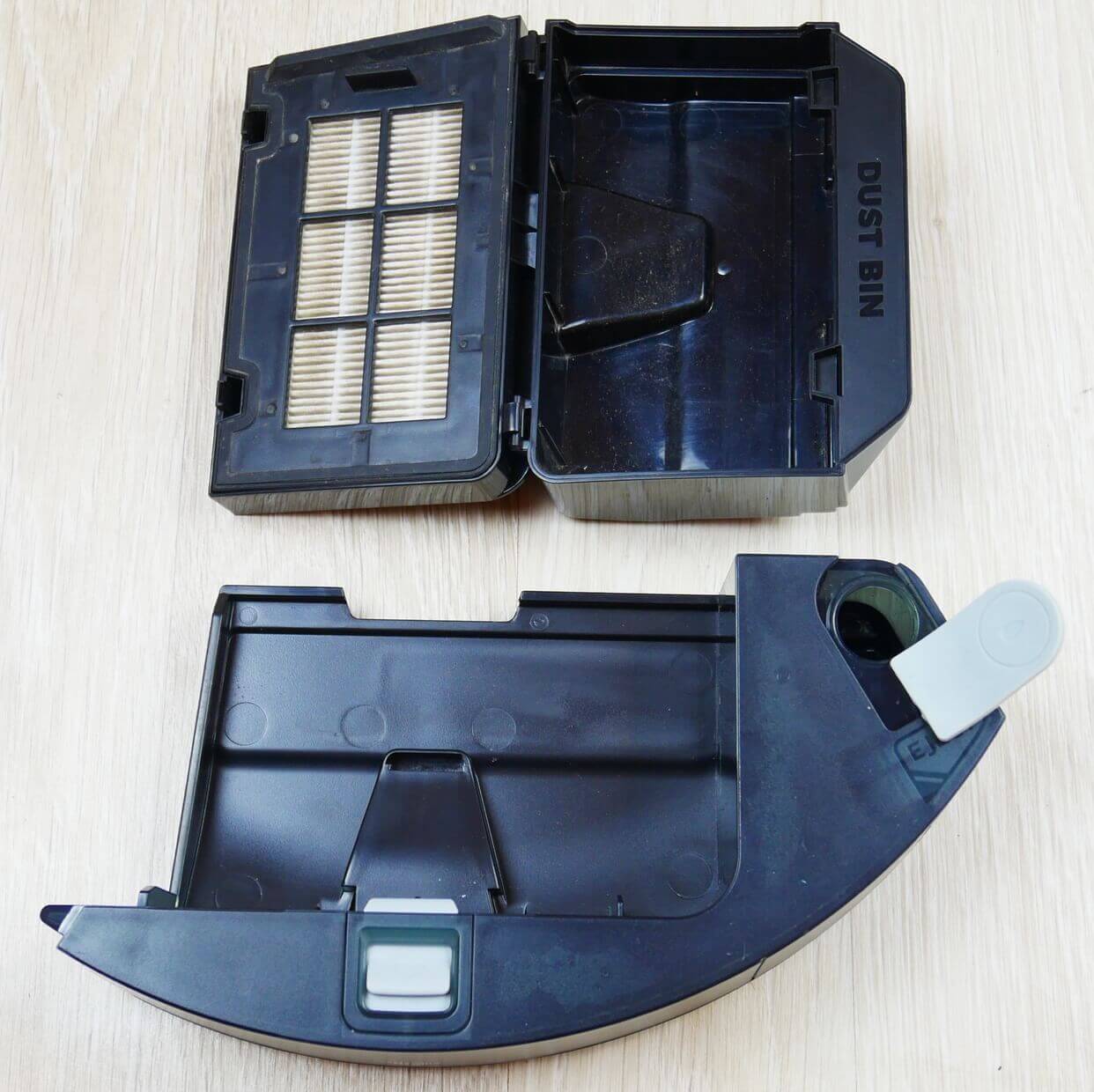 Dulkių talpykla atsidaro, kad būtų lengva ištuštinti. Apsauginis dangtelis apsaugo nuo atsitiktinio išsiliejimo išimant talpyklą iš roboto.