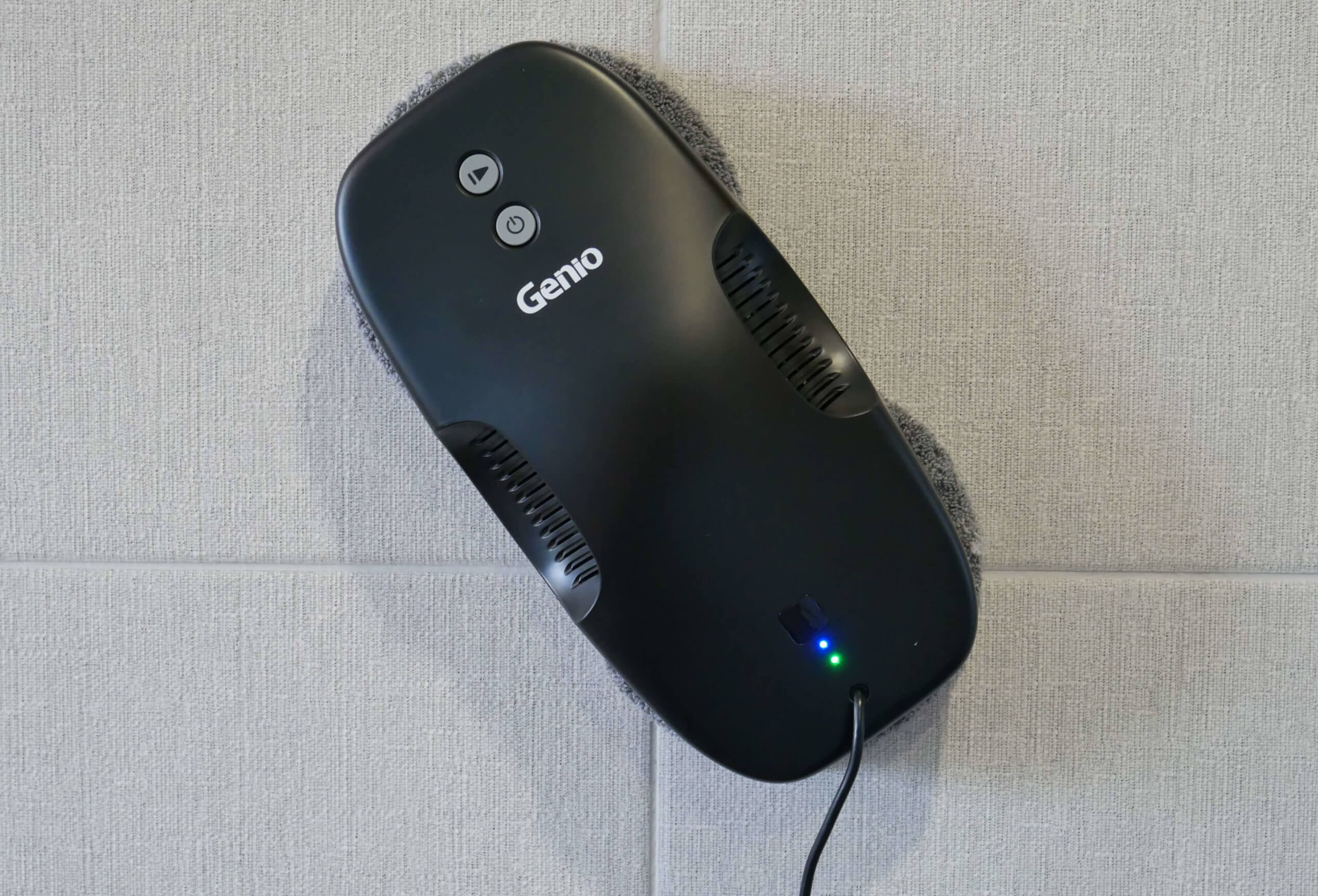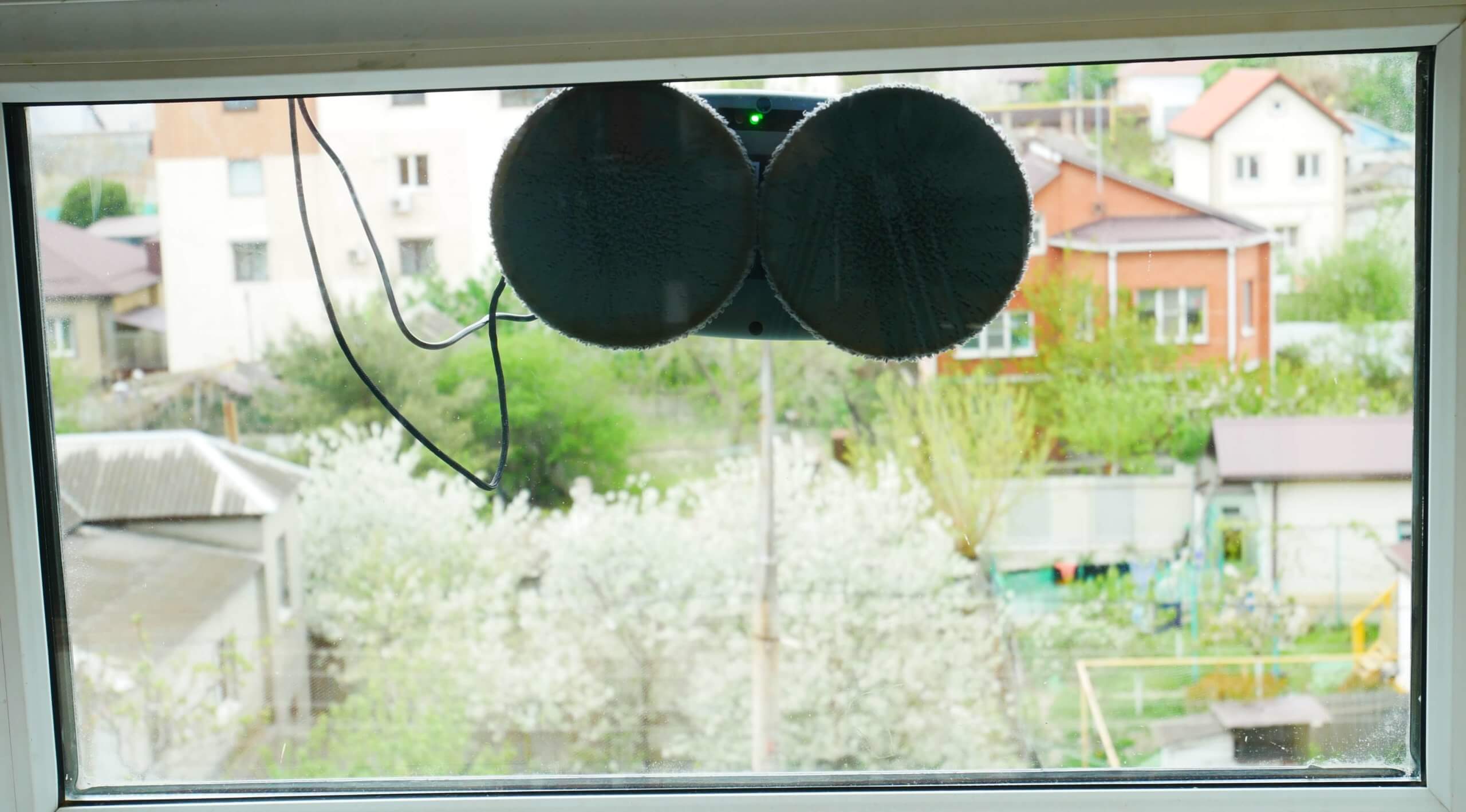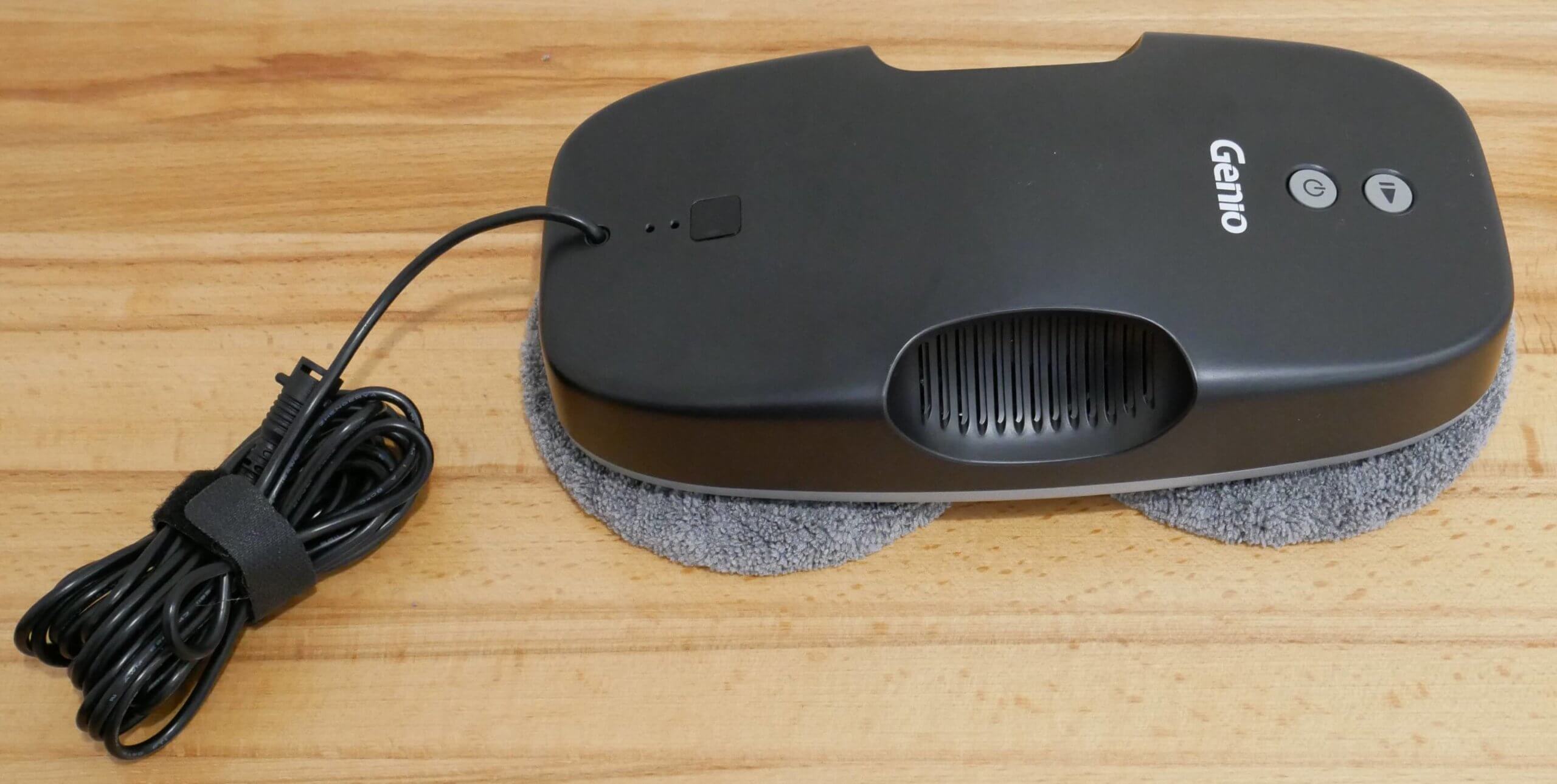 Prieš pradėdami bandymus, parodysiu, kaip paruošti „Genio Windy W200“ naudojimui. Pirmiausia prijunkite langų valymo robotą prie maitinimo lizdo. Prijunkite paties roboto maitinimo laidą prie maitinimo adapterio, o tada prijunkite kitą maitinimo adapterio laidą prie maitinimo lizdo. Kitas žingsnis – apsauginio laido pritvirtinimas. Įsukite apsauginio laido varžtą į patį robotą, kol jis sustos, o kitą galą karabinu pritvirtinkite prie nejudančio objekto, kuris galėtų išlaikyti roboto svorį, jei jis nukristų. Geriausias variantas – radiatorius po langu arba spintelės ar lovos koja.