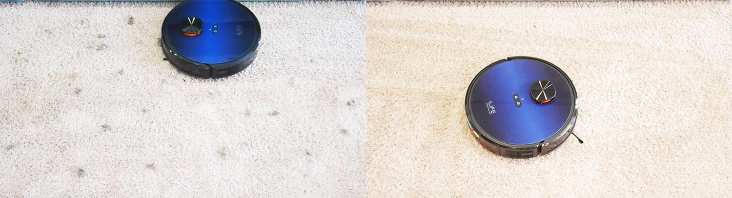 Kalbant apie kilimų valymą, robotas dulkių siurblys atliko geresnį darbą nei jo pirmtakas. Jis surinko didžiąją dalį šiukšlių, tačiau praleido kelias kailio ir plaukų kuokšteles. Tai greičiausiai lemia neplūduriuojantis centrinis šepečių blokas ir maža galia.