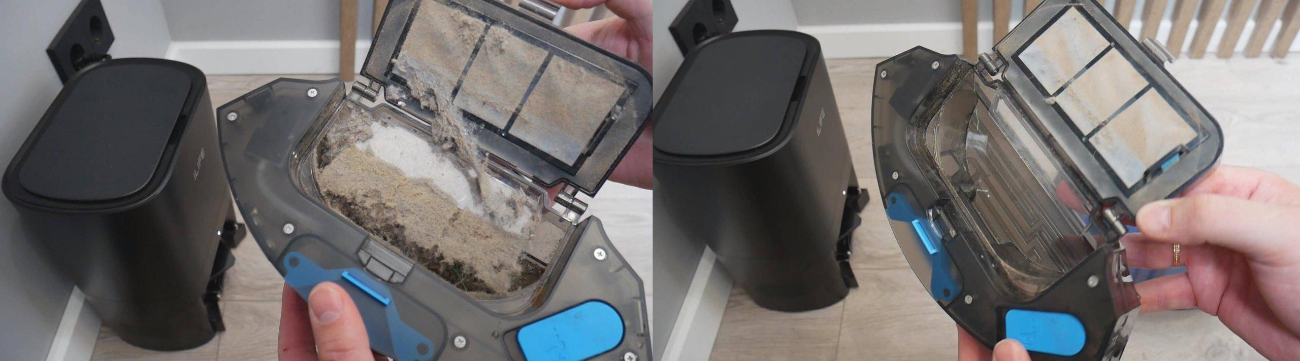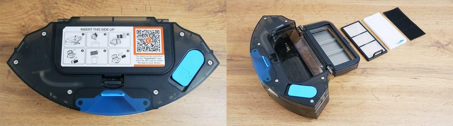 Kombinuotas vandens ir dulkių konteineris nuimamas iš galo. HEPA filtras nėra plaunamas, bet tinklelio ir putplasčio filtrai yra. QR kodas, skirtas roboto mobiliosios programėlės atsisiuntimui, yra ant korpuso. Dulkių konteineris talpina iki 250 ml vandens. Jame yra triguba filtravimo sistema: HEPA, putplasčio ir tinklelio filtrai. Vandens bako talpa – 240 ml. Viduje sumontuotas siurblys, kuris elektroniniu būdu reguliuoja ant valymo šluostės tiekiamo skysčio kiekį.