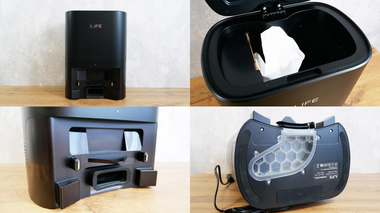 Kalbant apie stotelę, robotas pats ištuština šiukšles. Nėra platformos, ant kurios robotas galėtų užvažiuoti ir kuri apsaugotų grindis nuo sąlyčio su šlapia servetėle. Įkrovimo gnybtai ir prijungimo atbraila yra šalia šiukšlių latako siurbimo angos. Šiukšlių maišas yra po viršutiniu dangčiu. Jis yra standartinio dydžio ir talpina iki 2,5 litro sausų šiukšlių.