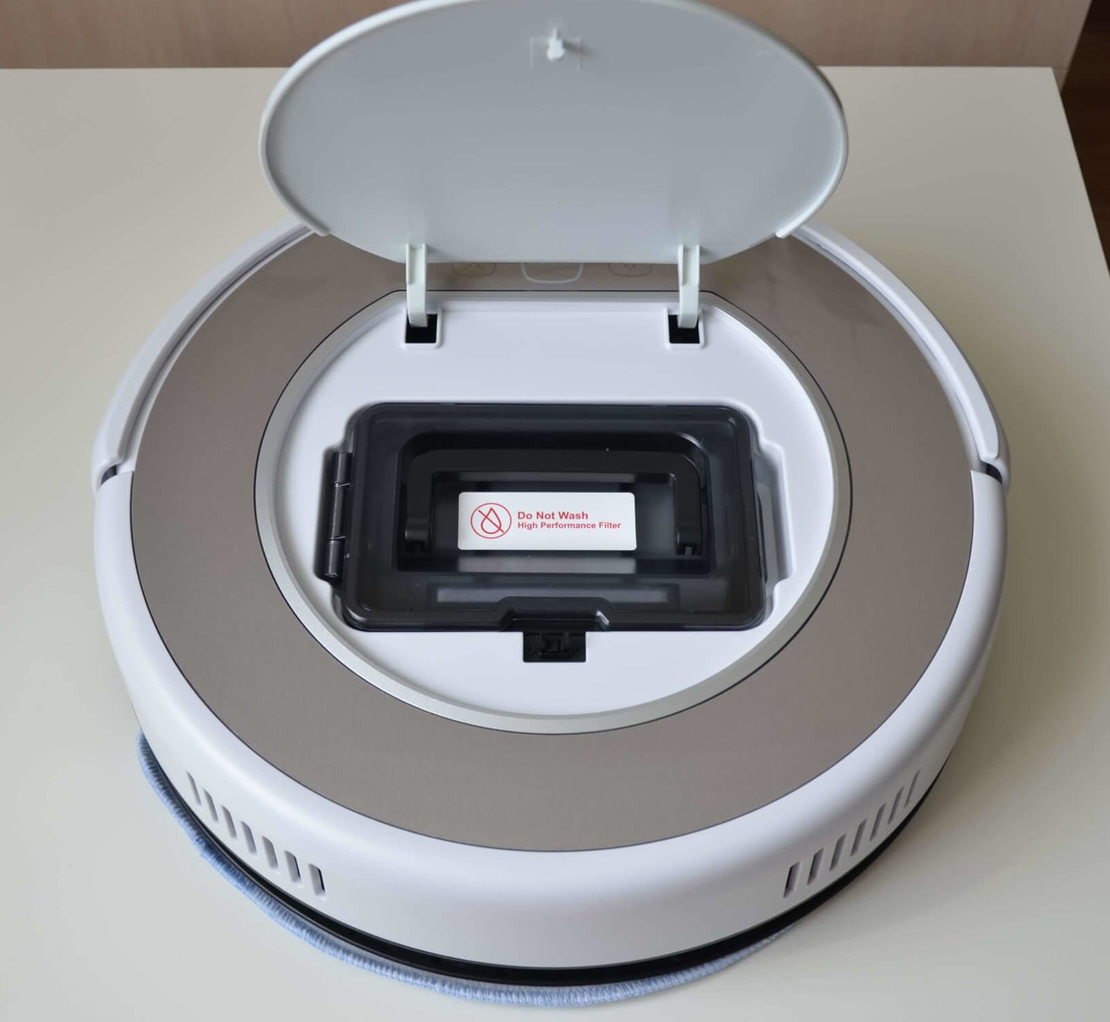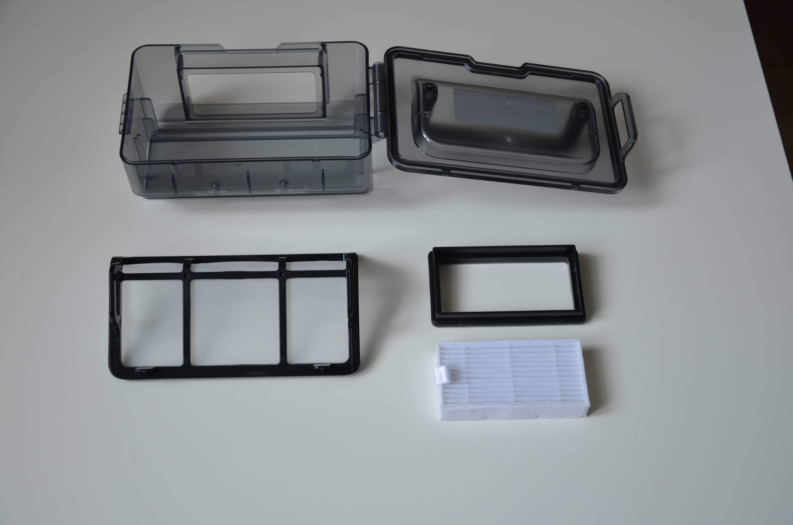 Dulkių surinkimo talpyklą lengva nuimti, o viršuje matome gamintojo įspėjimą, kad HEPA filtro negalima plauti vandeniu. Jį reikėtų periodiškai keisti, kad būtų išlaikytas valymo našumas ir išvengta roboto variklio pažeidimų dėl padidėjusios apkrovos. Dulkių surinkimo talpyklos dangtelis lengvai atsidaro, šone yra specialus fiksatorius. Viršuje matomas šiurkštus filtras. Pats dulkių surinkimo konteineris turi permatomą dangtelį, kuris apsaugo nuo atsitiktinio išsiliejimo nuimant dulkių surinkimo talpyklą. Beje, talpykloje telpa iki 300 ml sausų atliekų. Tai nėra daug, bet vienam valymo ciklui pakanka.