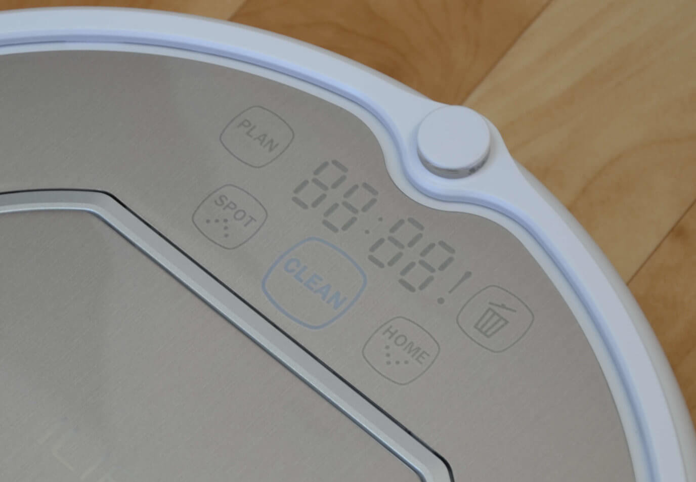 Viršutiniame kairiajame kampe yra mygtukas „PLAN“. Jį, kartu su apatiniu kairiuoju ir dešiniuoju mygtukais, galite naudoti valymo grafikui nustatyti. Centre yra mygtukas „Clean“, kuris inicijuoja automatinį valymą. Dešinėje jo pusėje yra mygtukas „Reversinis grįžimas į bazę“. Viršutiniame dešiniajame kampe yra pilnos dulkių surinktuvo indikatorius. Apatiniame kairiajame kampe yra mygtukas „SPOT“, kuris inicijuoja taškinį valymą.