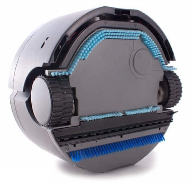 Pažvelgus į dulkių siurblio apačią, matyti du galingi šoniniai ratukai, aukščio jutikliai, antgaliai, siurbimo kanalai ir turbina, taip pat angos apatiniam skydeliui pritvirtinti grandikliu ir šepečiais.