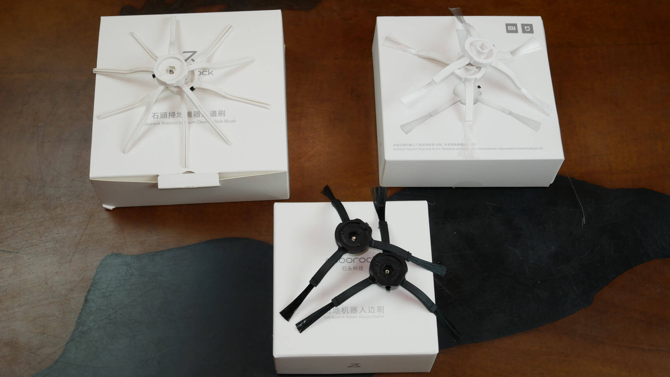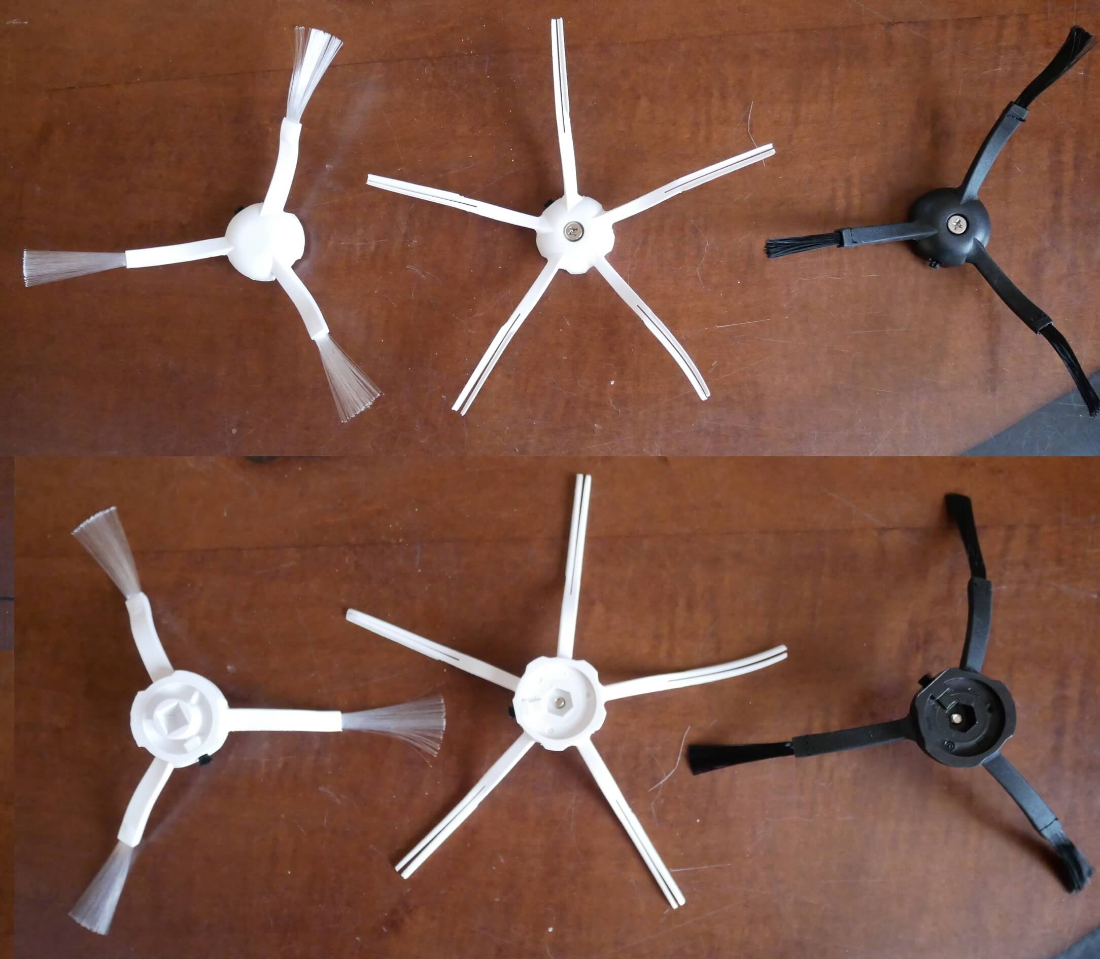Pirmiausia panagrinėkime „Roborock“ šepečius. Naujųjų šoninių šepečių detalės numeris yra SDBS03RR. Pagrindinis jų skirtumas yra silikoninė konstrukcija ir penkių smaigalių konstrukcija. Ši konstrukcija šiek tiek pagerina šlavimo našumą ir padidina šepečių patvarumą. Šoninis šepetys pritvirtintas varžtu ir turi būti prisukamas prie roboto atsuktuvu. Šone esantis šepetys palengvina plaukų valymą nuo šoninio šepečio. Senesnio šoninio šepečio detalės numeris yra SDBS02RR. Jis taip pat pritvirtintas varžtu ir turi trijų smaigalių konstrukciją, kietesnį silikoninį pagrindą ir šerelių šepetį. Pagrindinis šių šepečių skirtumas yra jų elastingumas. Silikoninis penkių smaigalių šepetys yra per minkštas, todėl jis mažiau efektyvus valant kilimus ir netgi gali būti pažeistas valant aukštaplaukius kilimus. Tačiau jis geriau veikė valydamas kietus paviršius. Todėl senesnio modelio trijų smaigalių šepetys labiau tinka valyti pūkuotus kilimus. Šepečiai yra baltos ir juodos spalvos.