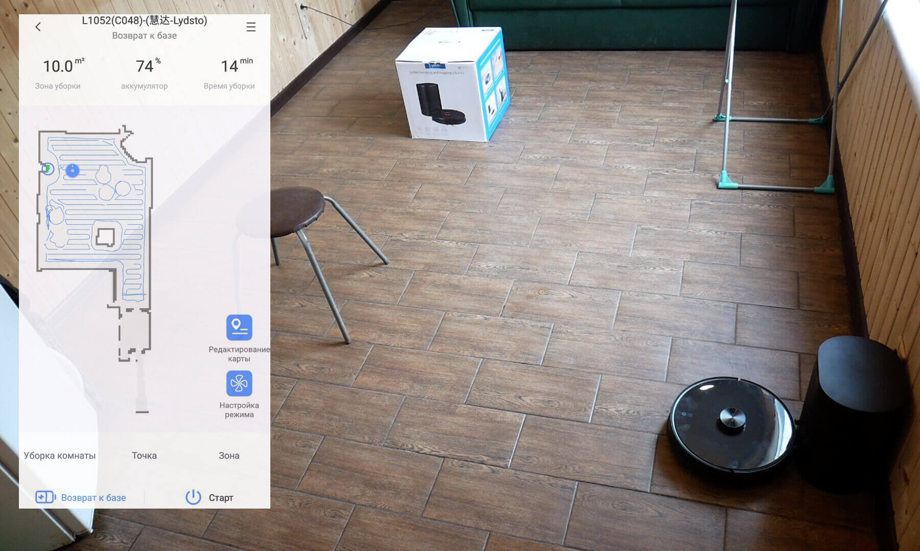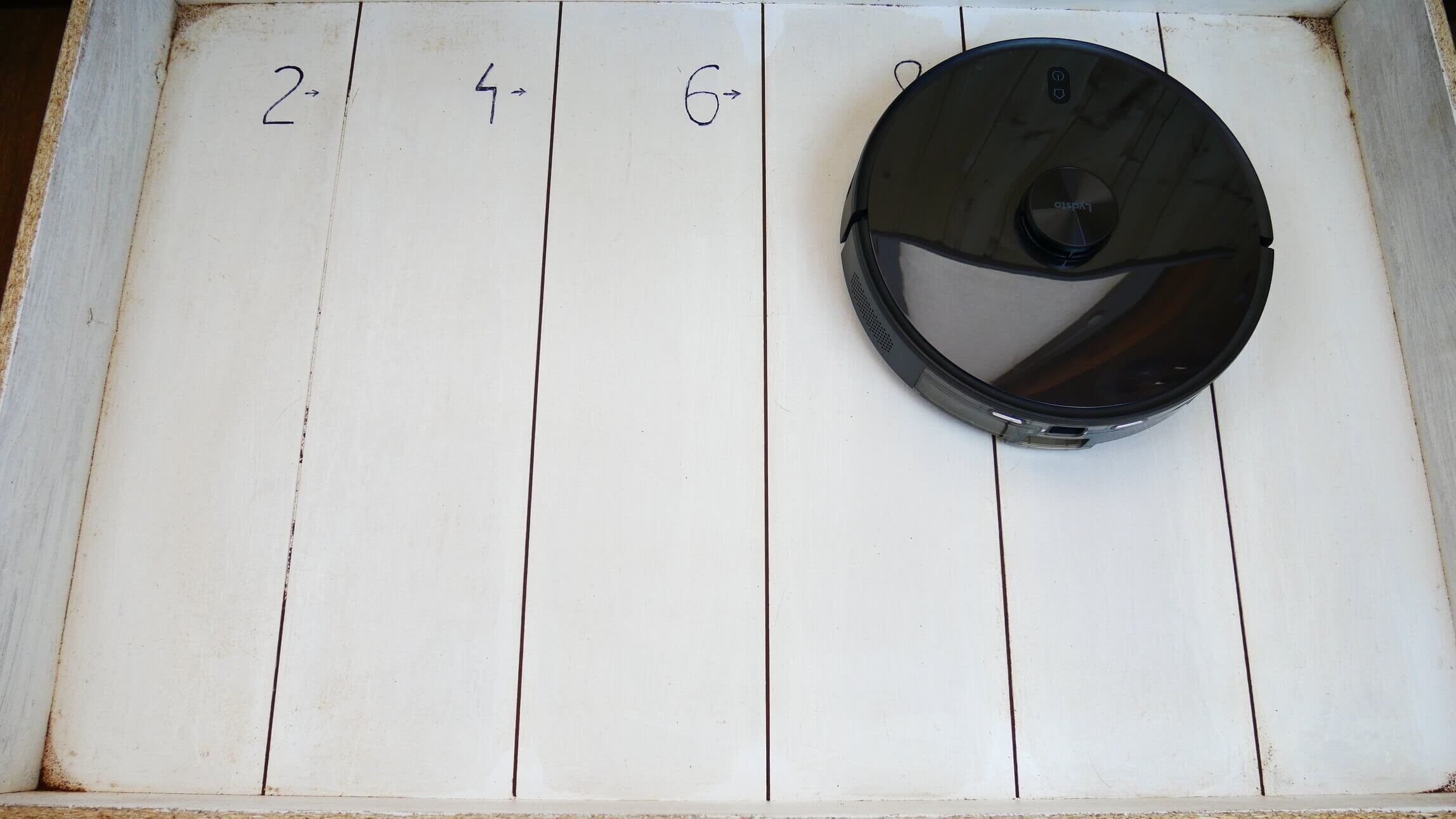 Pirmiausia robotas dulkių siurblys išvalo visą prieinamą plotą palei perimetrą. Kėdės kojos kėlė šiokį tokį iššūkį, tačiau jam pavyko jas apeiti ir tęsti valymą. Išvalęs perimetrą, „Lydsto R1“ pradėjo šluoti visą prieinamą plotą gyvatėmis. Jam pavyko išvalyti aplink tris iš keturių kėdės kojų ir dėžę atskirai, prieš grįžant į pagrindą. Bandymas buvo sėkmingas.