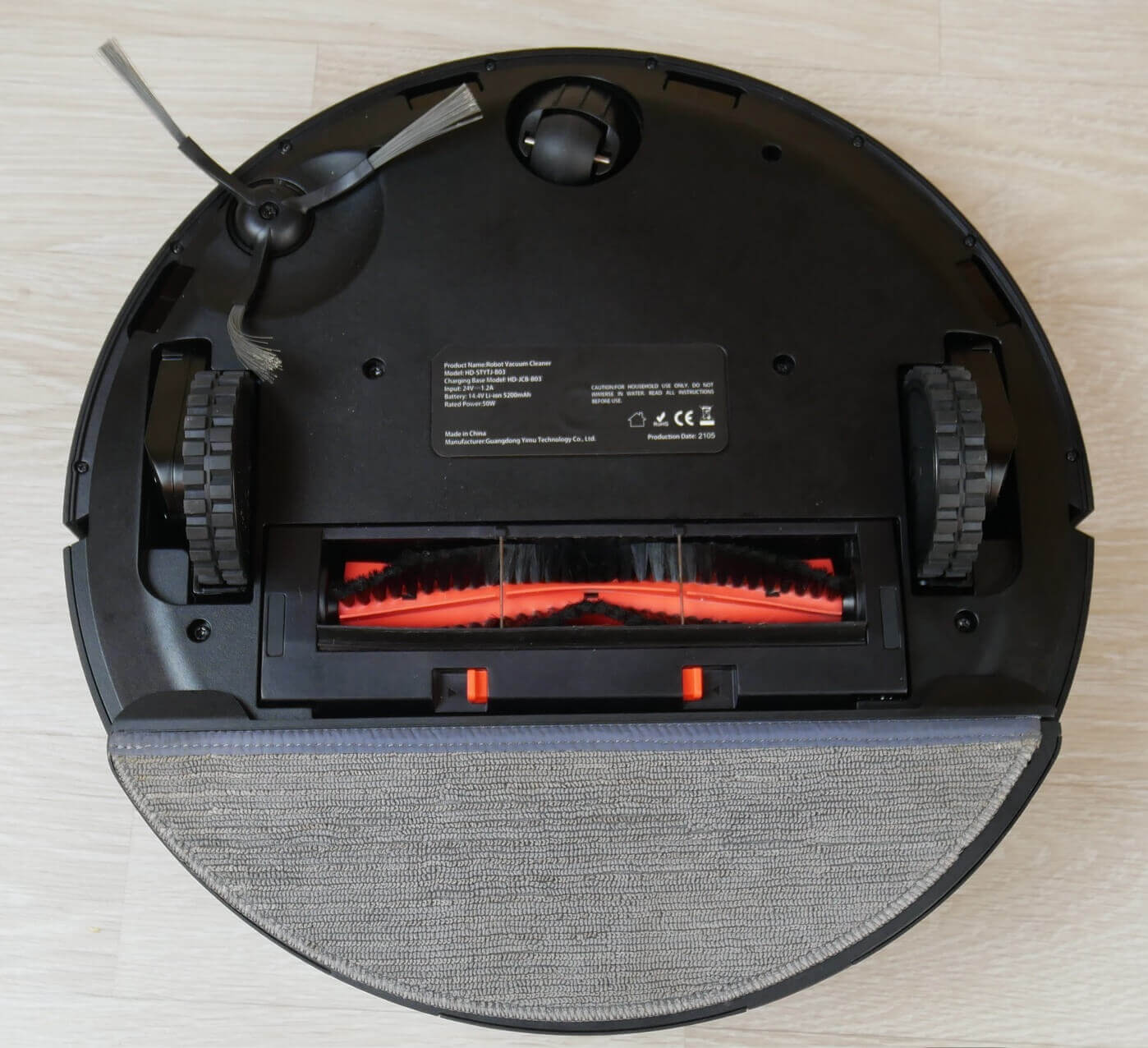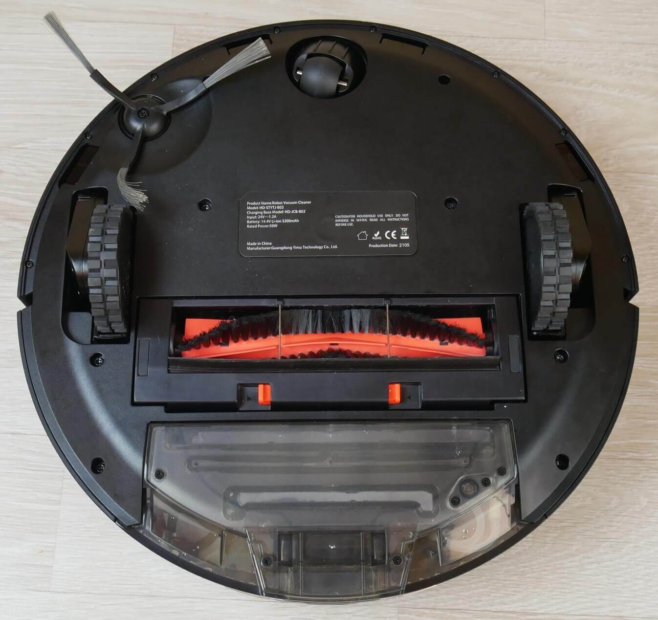 Pažvelkime į „Lydsto R1“ apačią. Jame yra keturi apsaugos nuo kritimo jutikliai. Jame yra vienas trijų sijų šoninis šepetys, pritvirtintas varžtu. Centrinis šepetys turi šerelius ir žiedlapius. Abi puses galima nuimti, kad būtų galima išvalyti plaukus ir naminių gyvūnėlių plaukus. Pats šepečio modulis yra plaukiojantis, todėl valymo metu jis geriau liečiasi su paviršiumi.