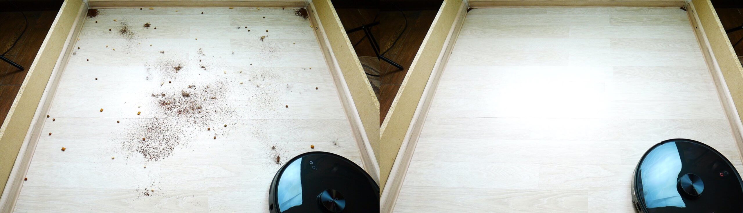 Laminuotų grindų cheminis valymas yra geras. Robotas dulkių siurblys sugebėjo surinkti nuo grindų daugumą šiukšlių. Tai apėmė ne tik smulkias buitines šiukšles, bet ir naminių gyvūnėlių plaukus, plaukus, kačių maistą ir net kraiką. Tik kampuose liko šiek tiek šiukšlių, kurių beveik visi rinkoje esantys robotai nesugeba efektyviai išvalyti.