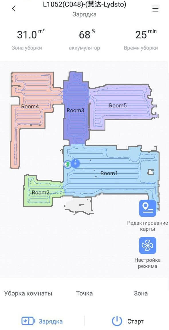 Grįžkime prie pagrindinio valdymo skydelio. Čia galite pasirinkti vieną iš trijų valymo režimų: kambario, taškinio arba zonos. Kambario režimu galite pasirinkti norimus valyti kambarius ir jų valymo tvarką. Taškinio režimu galite nukreipti „Lydsto R1“ į konkretų žemėlapio taškinį valymą arba pradėti taškinį valymą ten, kur robotas šiuo metu yra. Zoniniu režimu galite pasirinkti žemėlapio sritis, kurias norite, kad robotas dulkių siurblys valytų. Taip pat galite pasirinkti pasirinktos zonos praėjimų skaičių: vieną arba du.