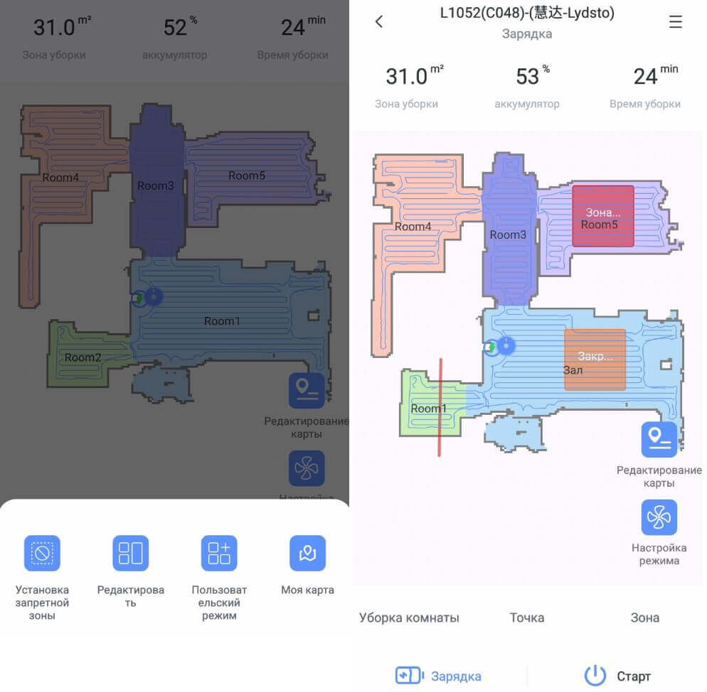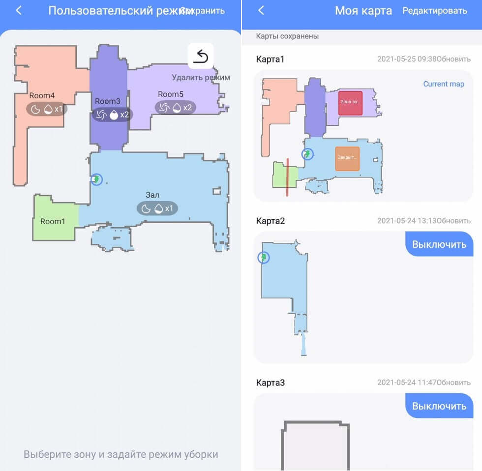 Yra naudingas naudotojo režimas, leidžiantis pritaikyti kiekvieno kambario valymo nustatymus, reguliuojant siurbimo galią ir vandens srautą. Tai didelis „Lydsto R1“ pranašumas, palyginti su daugeliu panašių įrenginių. Be to, žemėlapių skiltyje matome, kad robotas dulkių siurblys gali išsaugoti kelis valymo žemėlapius savo atmintyje.