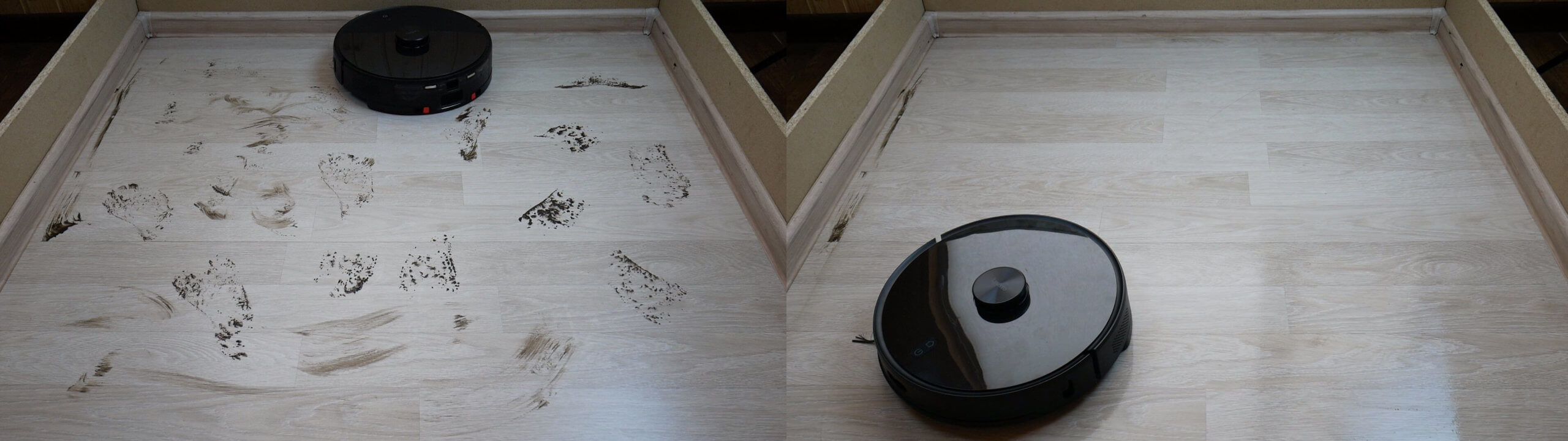 Taip pat neturime jokių priekaištų dėl šlapio valymo. Laminuotų grindų valymo kokybė neprilygsta aukščiausios klasės analogams. Ant grindjuostės liko tik viena dryželė, tačiau tai visų iki šiol apžvelgtų robotų dulkių siurblių silpnoji vieta.