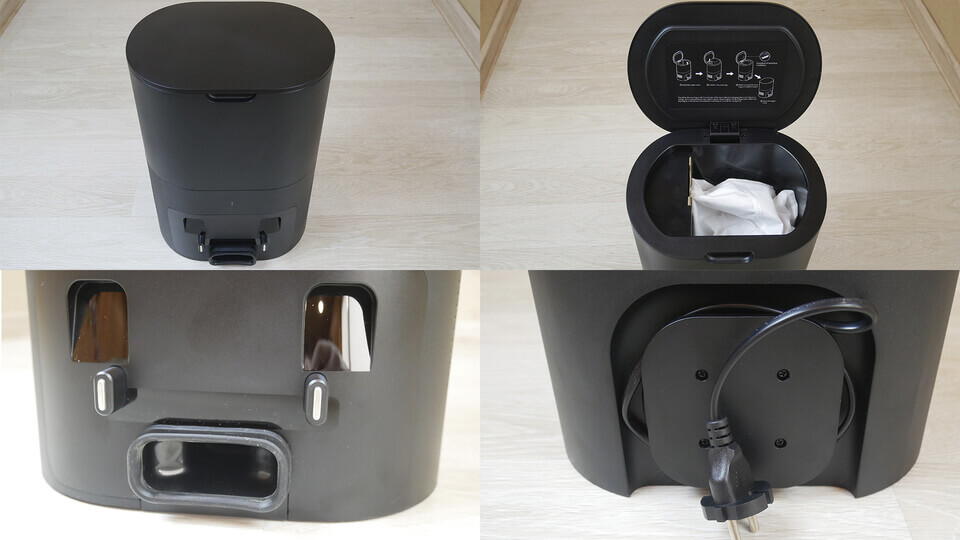 Dabar pažvelkime į patį pagrindą. Jis taip pat juodas, bet matinė plastikinė apdaila mažiau lengvai susitepa. Yra skyrius laido pertekliui, o tai yra privalumas. Dulkių surinktuvo siurbimo anga yra gale. Tai pagreitina savaiminio valymo procesą ir pagerina ištuštinimo kokybę.