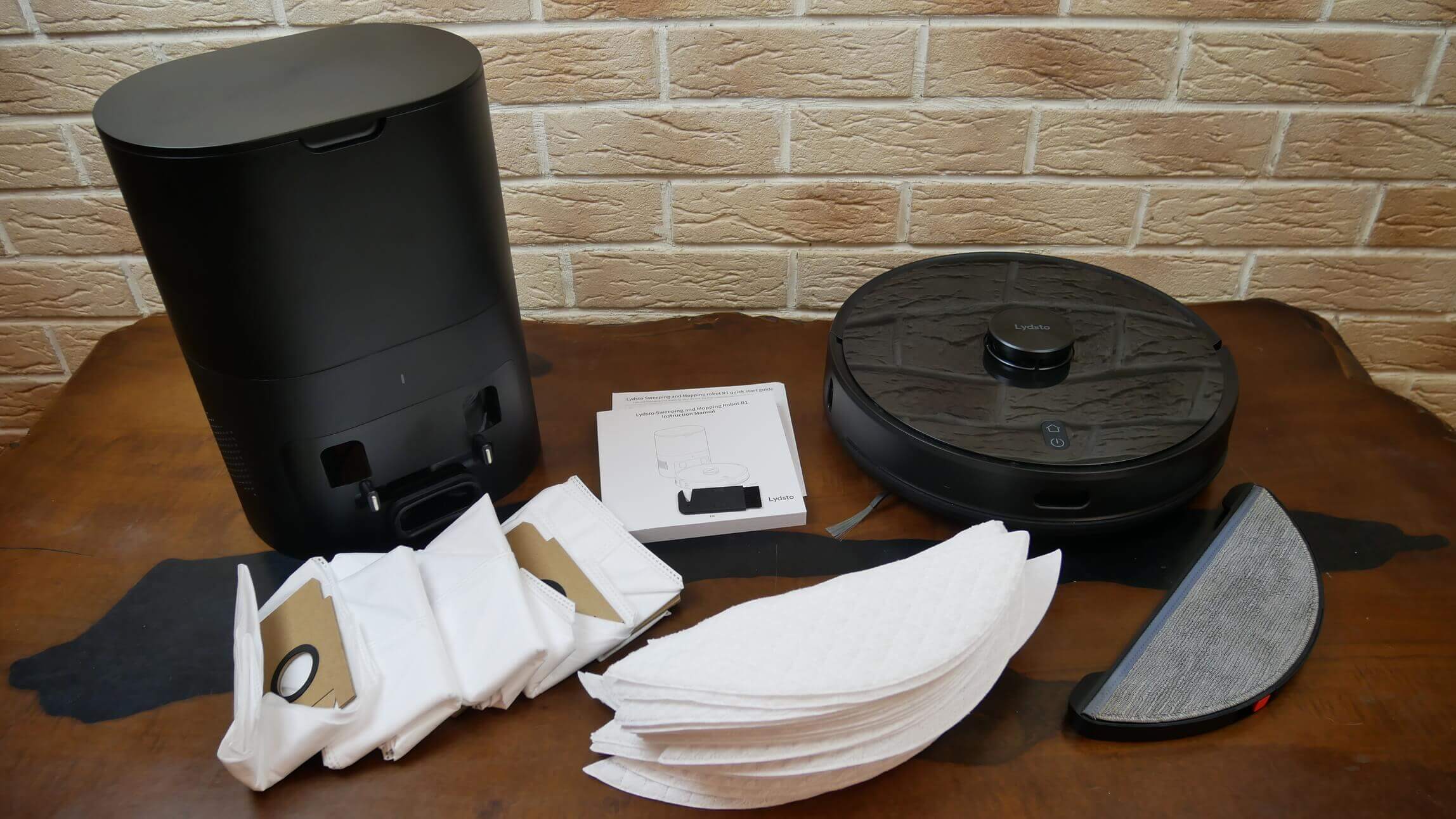 Pirmiausia apžvelkime „Lydsto R1“ komplektą. Be paties roboto dulkių siurblio ir savaiminio valymo stotelės, rinkinyje yra:
