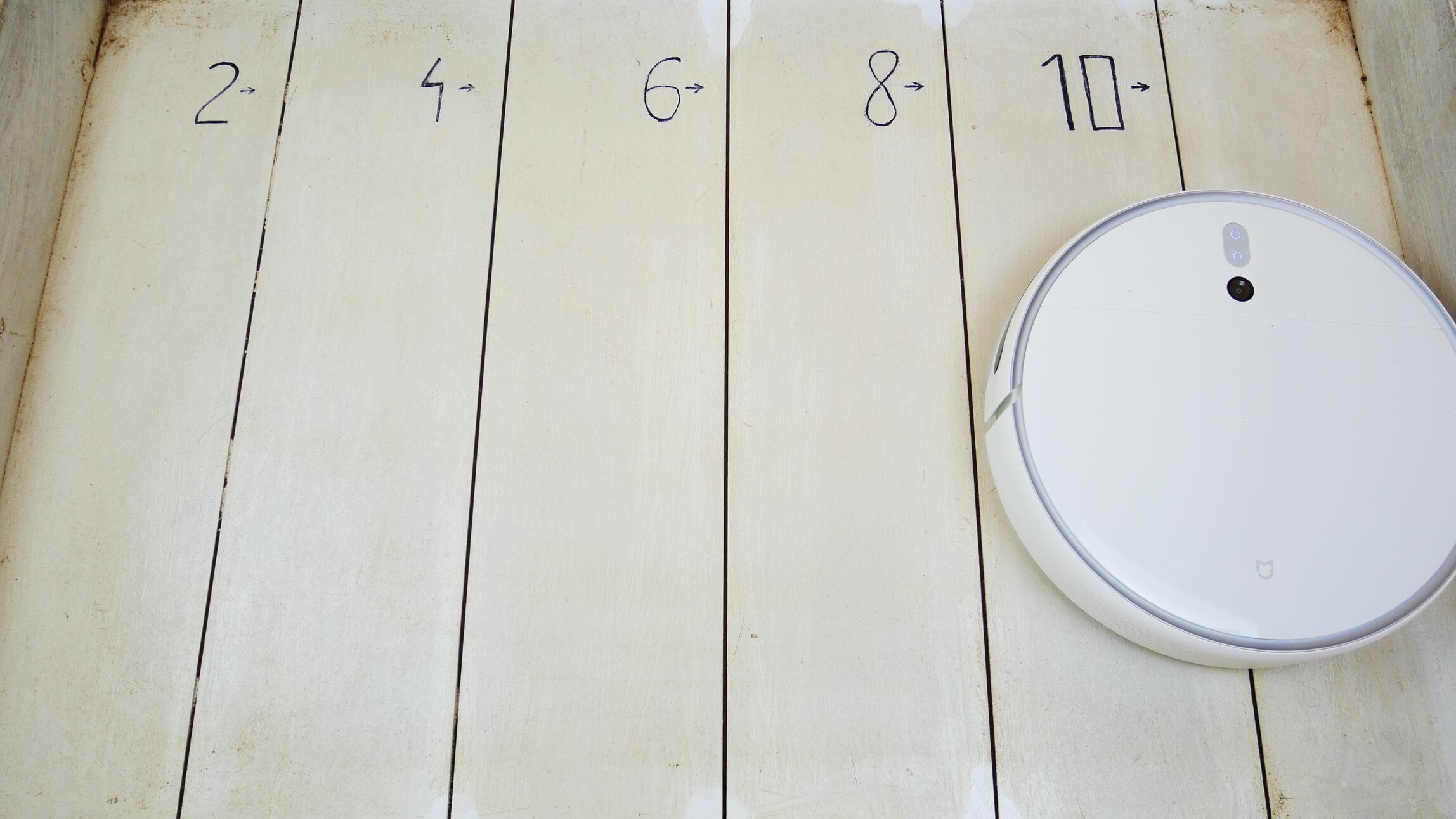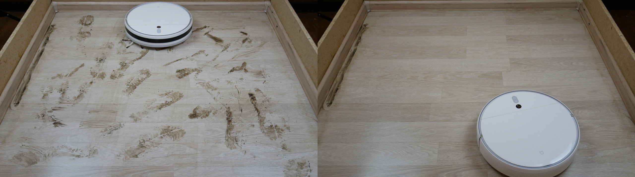 Valymo efektyvumas taip pat geras – stovas praktiškai švarus, ant grindų nepalieka jokių dryžių. Matome tik nedidelį plotą palei grindjuostę, kurio robotai negali išvalyti dėl savo konstrukcijos.