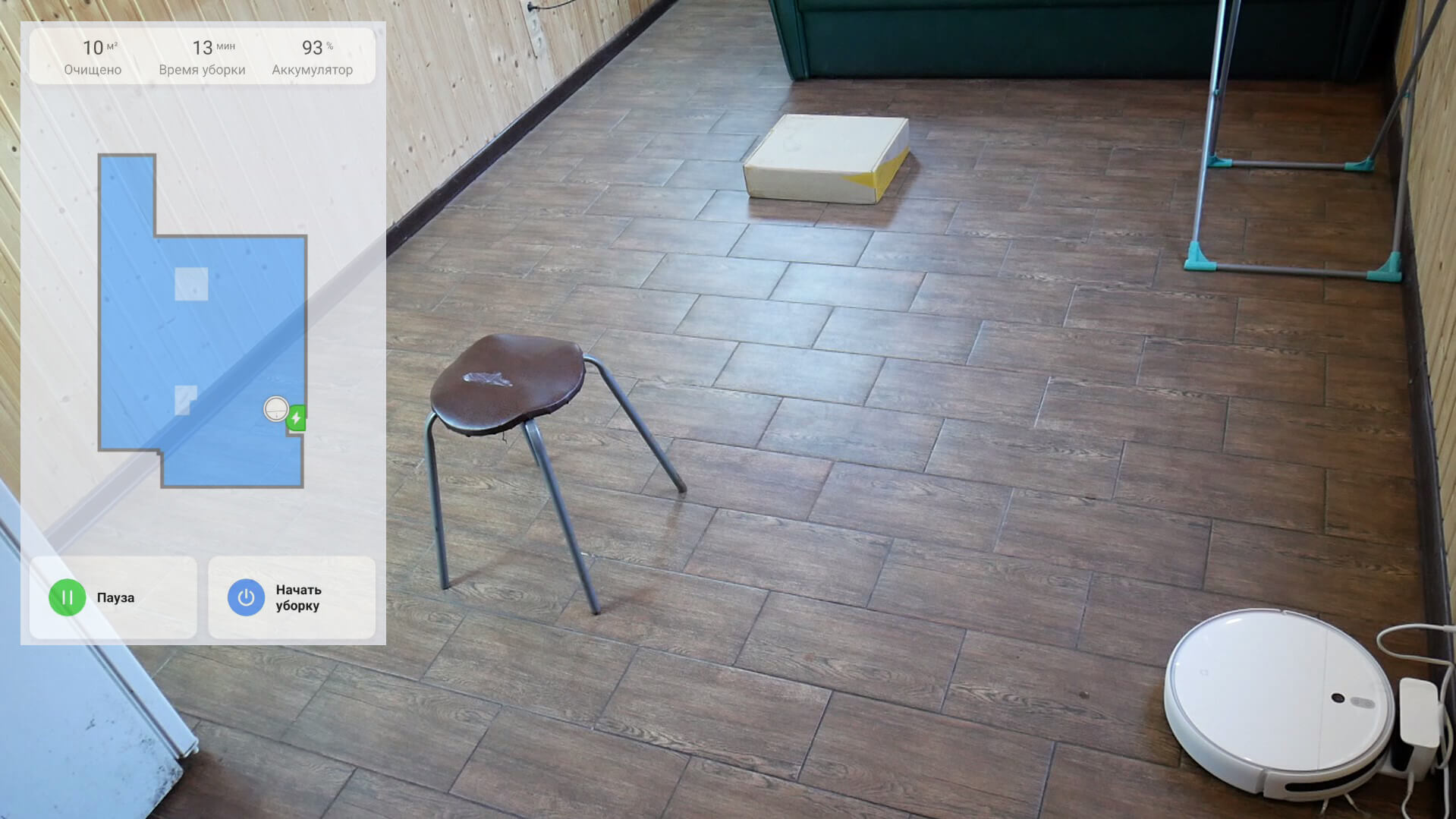 Galiausiai pereikime prie testų. Pirmiausia išbandysime „Xiaomi Mijia 2C“ navigaciją kambaryje su kliūtimis. Pirmiausia robotas dulkių siurblys pervažiuoja visą prieinamą plotą gyvatiškai, o tada aplink perimetrą. Jis neužsikabino ant džiovyklės, bet taip pat neužkliūno už kėdės kojų ar dėžės. Navigacija yra standartinė.