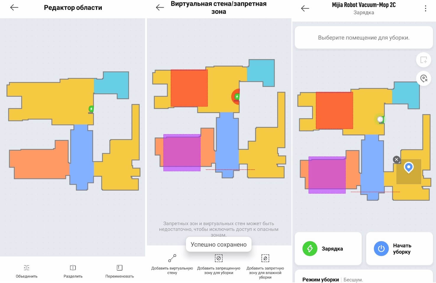 Žemėlapio skiltyje galite redaguoti kambarių ribas, jas sujungti ir atskirti. Taip pat galite kiekvienam kambariui suteikti pavadinimą. „Xiaomi Mijia 2C“ palaiko virtualių sienų ir draudžiamų zonų nustatymą žemėlapyje, įskaitant atskiras draudžiamų zonų šlapio valymo režimui, o tai yra privalumas.