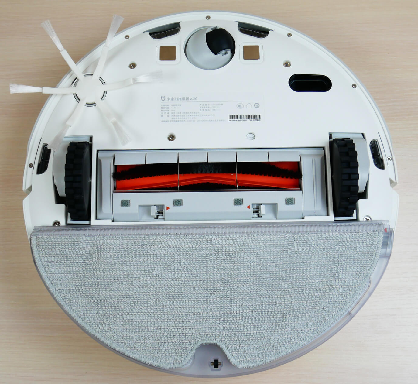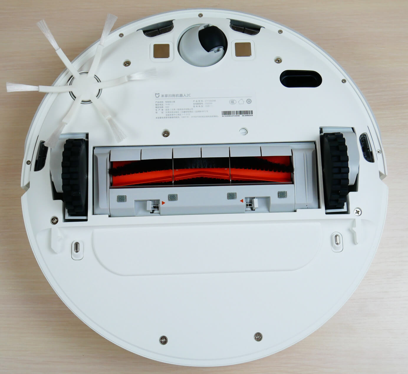 Pažvelkime į „Xiaomi Mijia 2C“ apačią. Joje yra keturi apsaugos nuo kritimo jutikliai ir papildomas optinis jutiklis apačioje, kuris padeda robotui orientuotis aplinkoje.