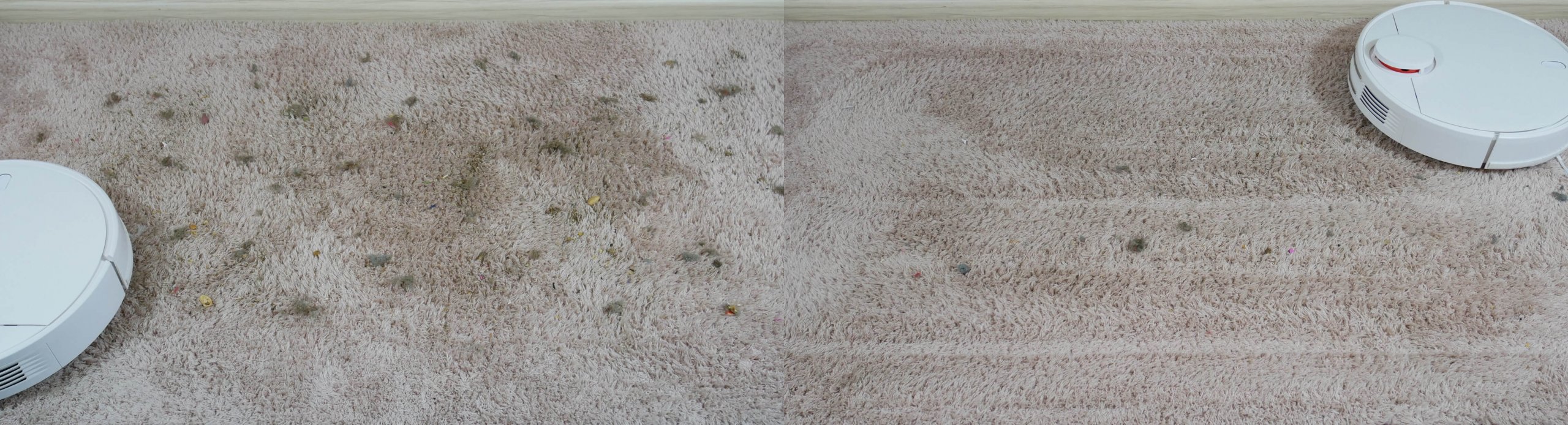 Vis dėlto kilimų valymo našumas yra prastesnis nei vidutinis, kas būdinga daugumai „Mijia“ linijos robotų dulkių siurblių. Vos po kelių perbraukimų kilimu robotas paliko šiek tiek plaukų ir naminių gyvūnėlių plaukų. Taigi, kilimų valymas akivaizdžiai nėra jo stiprioji pusė.