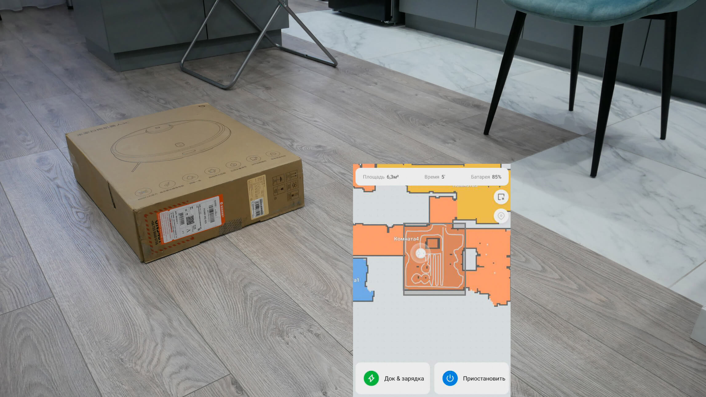 Galiausiai pereikime prie testų. Pirmiausia patikrinsime roboto navigaciją kambaryje su kliūtimis. Robotas dulkių siurbliu išvalė visą prieinamą plotą palei perimetrą, o tada – vingiuotu būdu. Jis taip pat išvalė aplink dėžę ir kėdžių kojas ir neužstrigo ant džiovyklės. Judesio sekimo testo atlikti nepavyko, nes, kaip ir įprasta „Xiaomi“ gaminiams, programėlė užstrigo. Tačiau kalbant apie navigaciją, šis testas buvo sėkmingas.