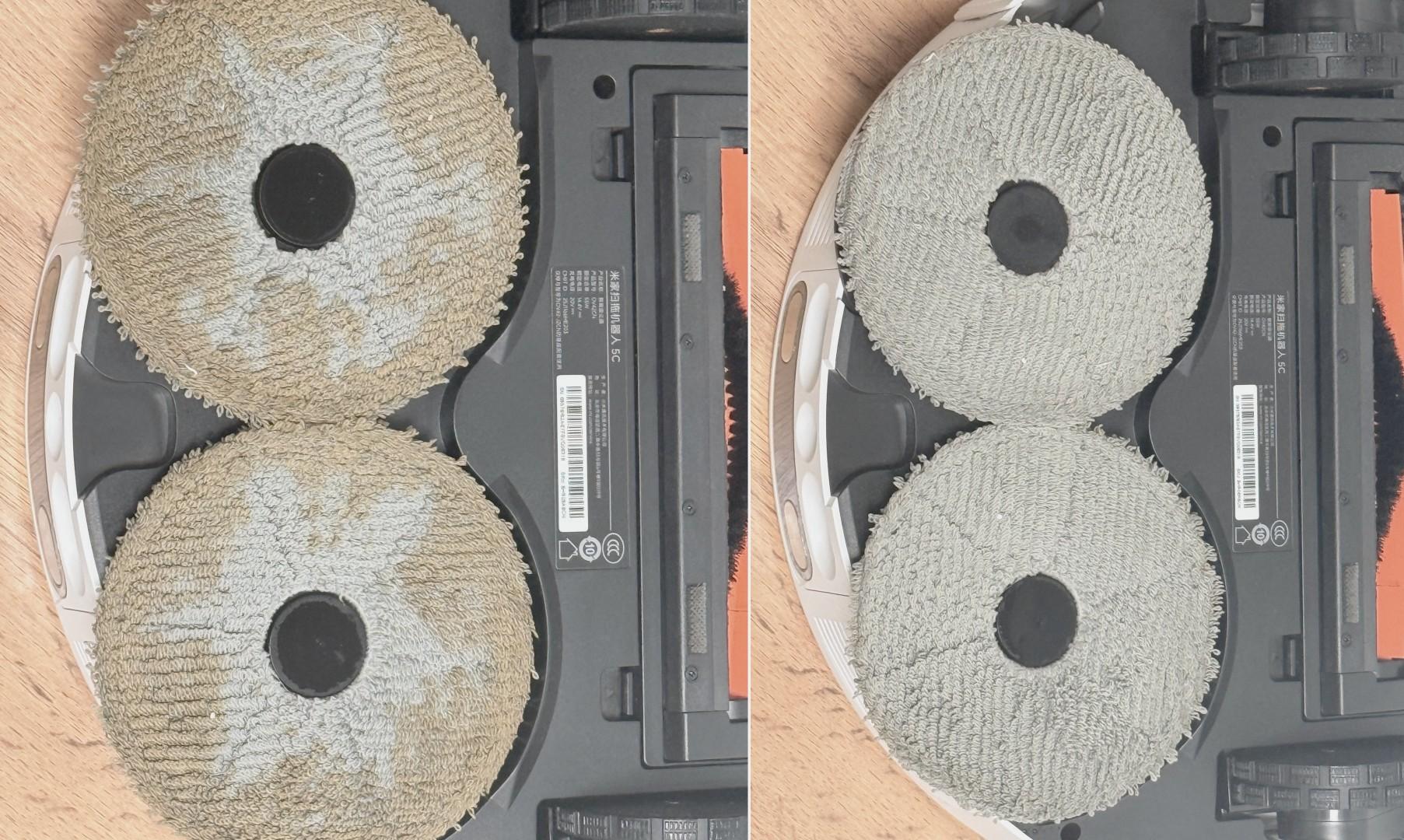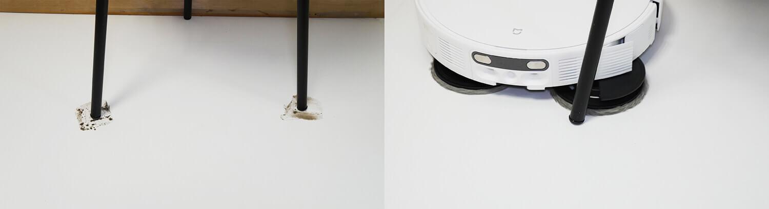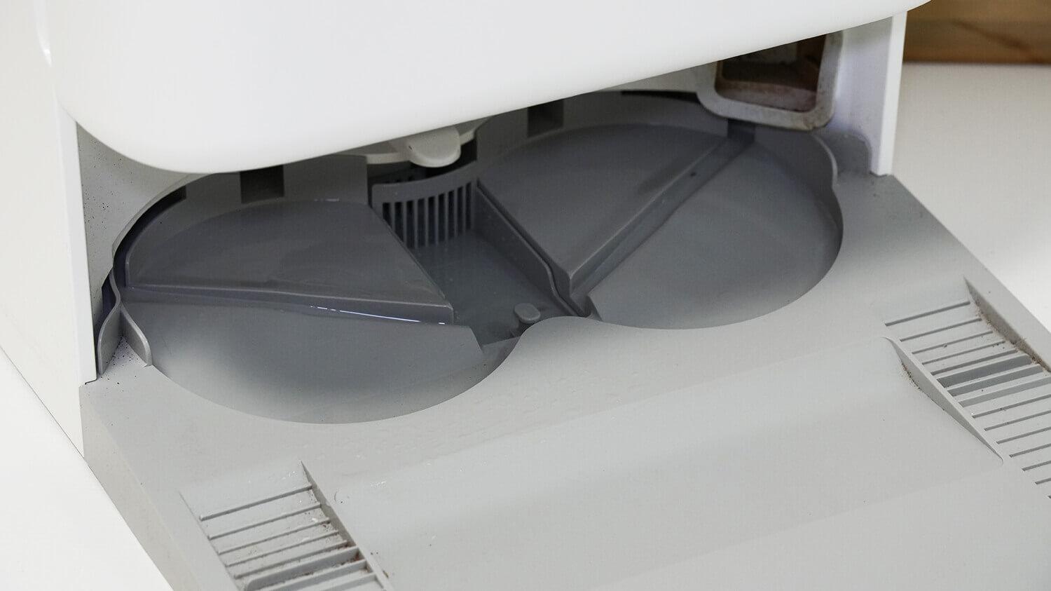Norėčiau atkreipti dėmesį, kad atnaujintas laikiklio atleidimo mechanizmas išties pagerina grindų valymo efektyvumą kampuose, tiek viduje, tiek išorėje, o robotas dulkių siurblys taip pat kruopščiau valo grindis aplink kėdžių kojas. Kaip matote, visiškai neliko nešvarumų. Tai pliusas!