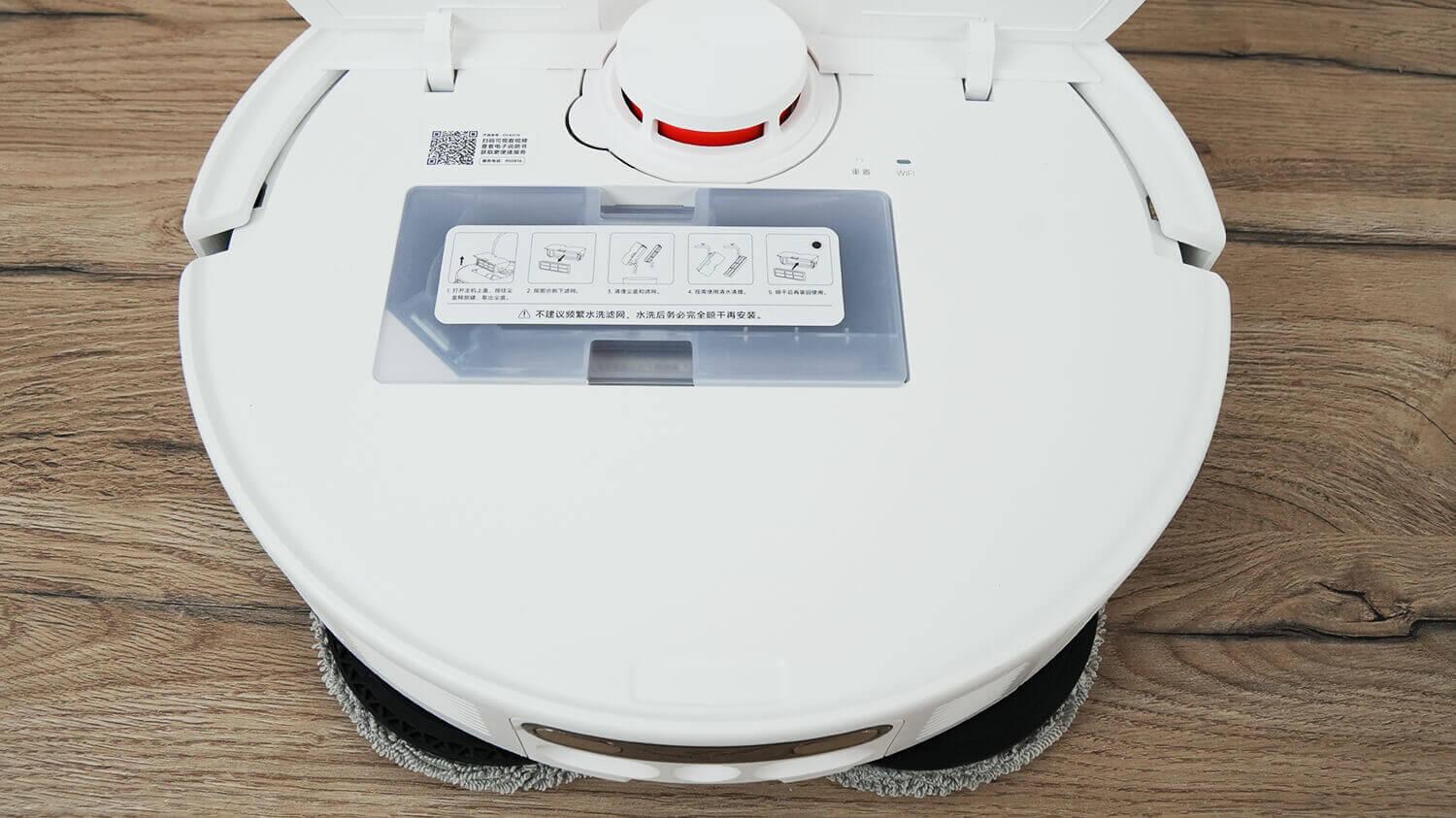 Dulkių surinktuvas yra po viršutiniu dangčiu. Filtravimo sistema pagrįsta tik HEPA filtru, kurį galima plauti vandeniu. Konteinerio talpa yra maždaug 290 ml. Robotas neturi vandens bako. Šluostės sudrėkinamos tik skalbimo stotelėje skalbimo ciklo metu.