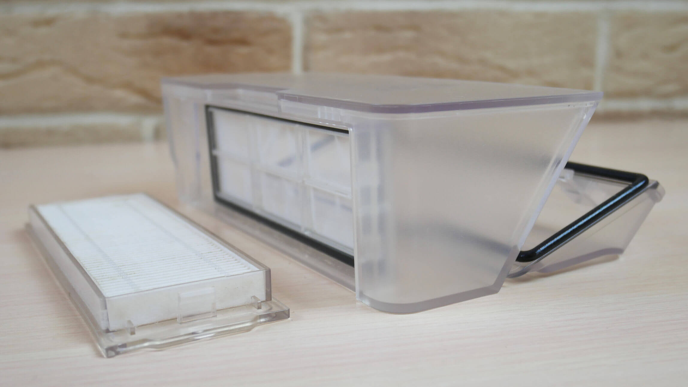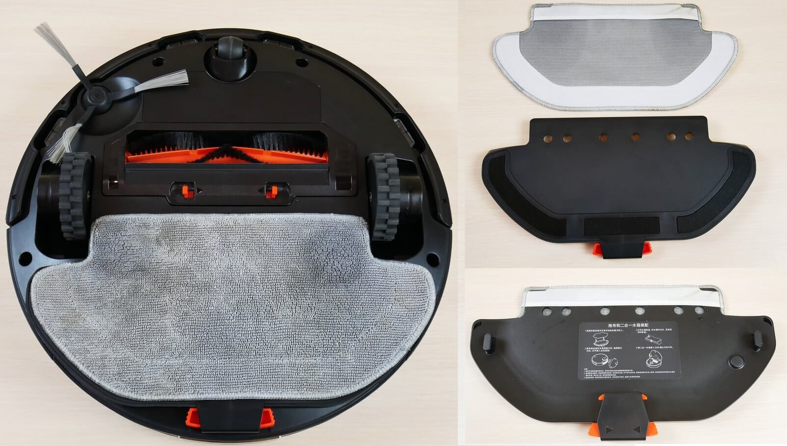 Drėgno valymo šluostė yra didelė, pritvirtinta lipdukais ir kišene. Vanduo teka per šešias skylutes, o tai puiku. Robotai paprastai turi dvi ar tris vandens tiekimo angas.
