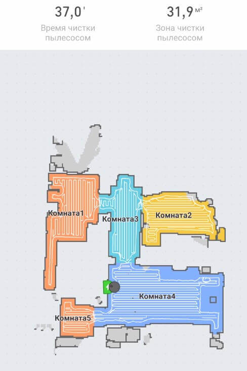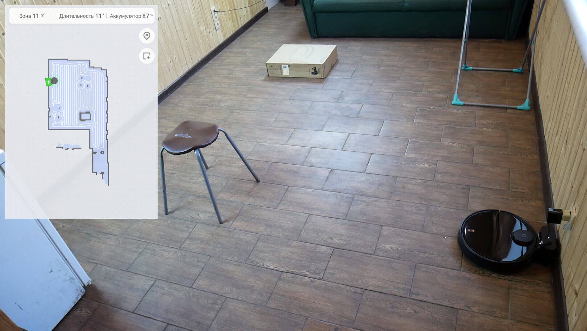 Pirmiausia patikrinkime roboto dulkių siurblio navigaciją kambaryje su kliūtimis. „Xiaomi Mijia LDS“ dulkių siurblys pirmiausia išvalo visą pasiekiamos zonos perimetrą, tada pradeda valyti gyvatės būdu. Jis neužstrigo ant džiovyklės ir atskirai apvalė dėžę bei visas kėdžių kojas, o tada be jokių kliūčių grįžo į savo pagrindą. Testas buvo sėkmingas!