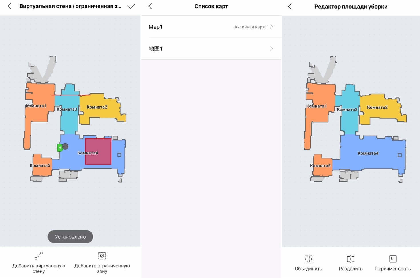 Kalbant apie darbą su žemėlapiu, galite įjungti arba išjungti žemėlapio saugojimą, nustatyti virtualias sienas ir ribojamas zonas žemėlapyje, pasirinkti norimą žemėlapį iš išsaugotų žemėlapių sąrašo ir redaguoti sukurtą žemėlapį. Pavyzdžiui, galite pakeisti kambarių ribas arba suteikti jiems pavadinimus.