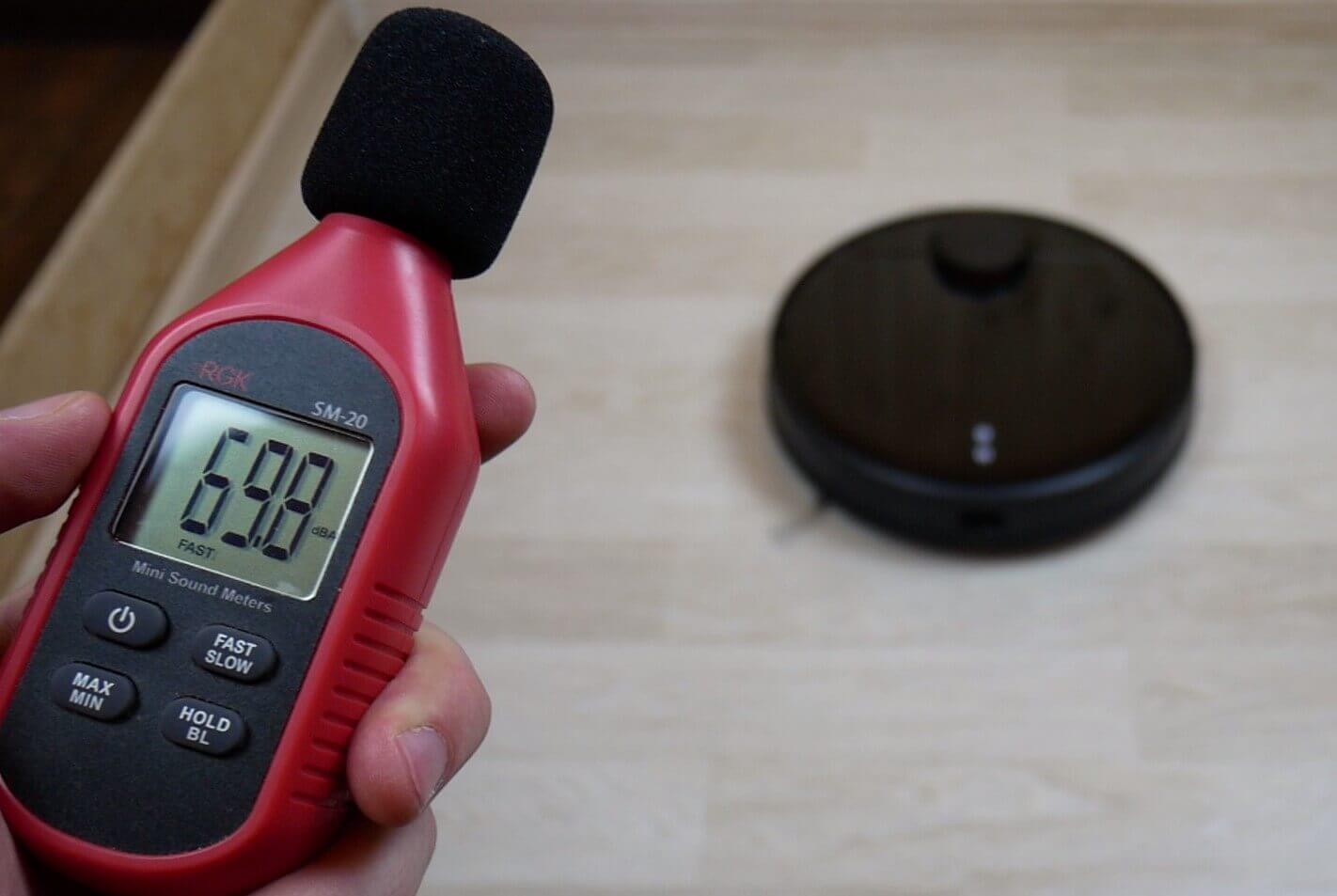 Galiausiai išmatavome roboto triukšmo lygį skirtingais režimais. Net ir esant minimaliai siurbimo galiai, triukšmo lygis siekia 64,5 dB. Standartiniu režimu triukšmo lygis pakyla iki 68 dB. Vidutiniu režimu triukšmo lygis siekia 71 dB, o turbo režimu didžiausias buvo 73 dB. Reikia pripažinti, kad tai gana triukšmingas robotas dulkių siurblys, nepaisant standartinės siurbimo galios.