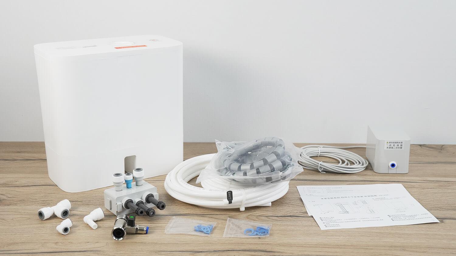 Jame yra pats robotas su stotimi, taip pat du laikikliai su servetėlėmis, maitinimo adapteris su kinišku kištuku, adapteris europietiškam lizdui ir instrukcijos kinų kalba.