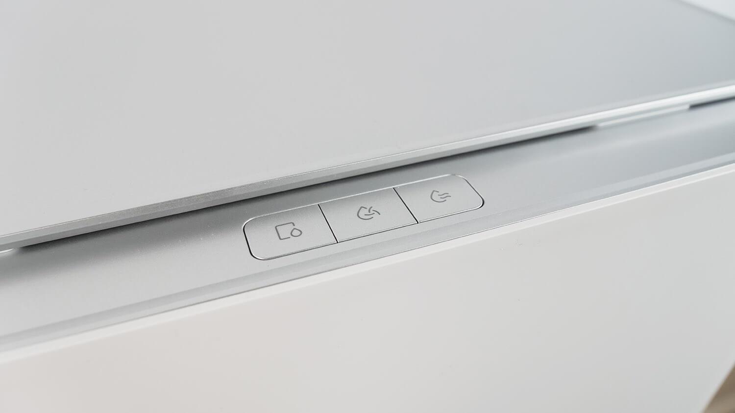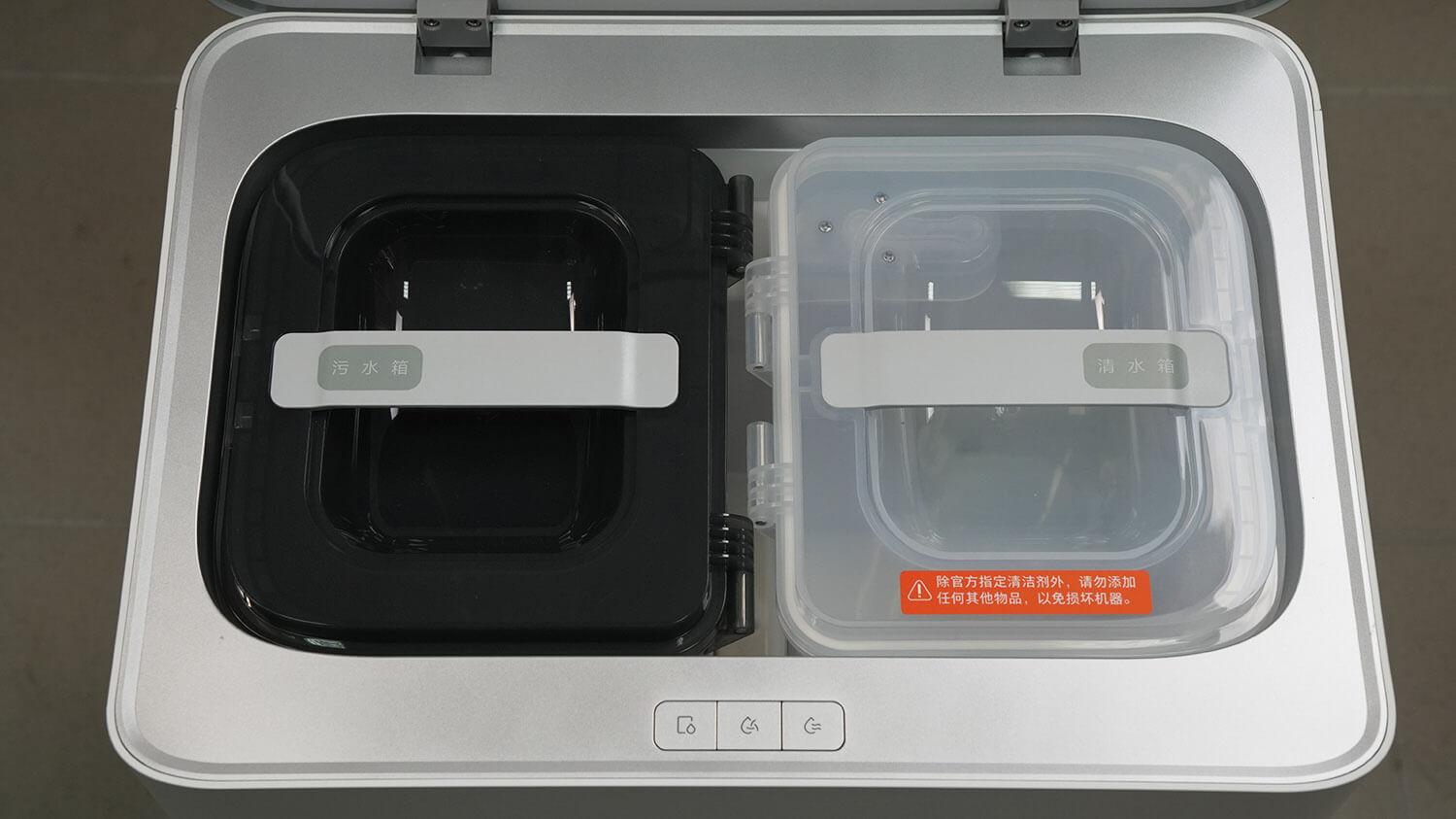 Stotelėje nėra ploviklio skyriaus. Ploviklio į švaraus vandens baką reikės įpilti rankiniu būdu pagal poreikį. Stotelės viršuje taip pat matomi trys mechaniniai valdymo mygtukai.