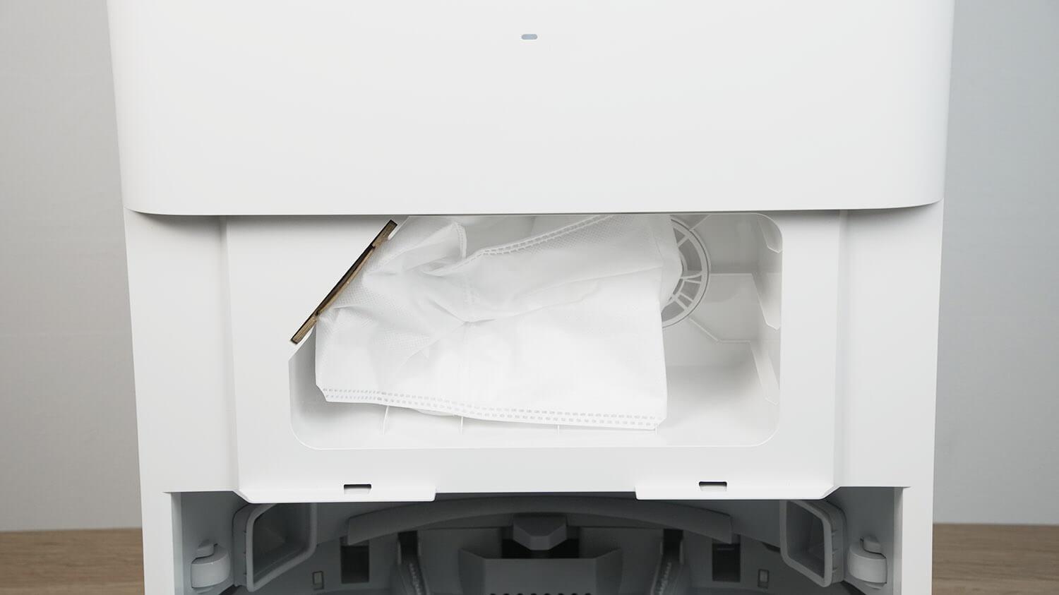 Dulkių surinkimo konteineris yra po viršutiniu dangčiu. Filtravimo sistemoje naudojamas tinklelis ir HEPA filtras. Savaime išsivalanti užuolaida yra konteinerio šone stotelėje. Atkreipkite dėmesį, kad pats robotas neturi vandens bako. Šluostės stotelėje sudrėkinamos tik iš anksto nustatytu intervalu.