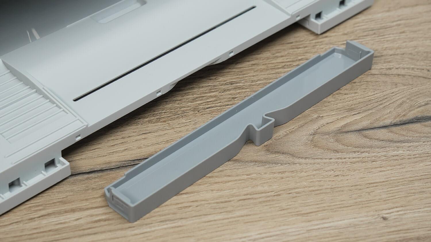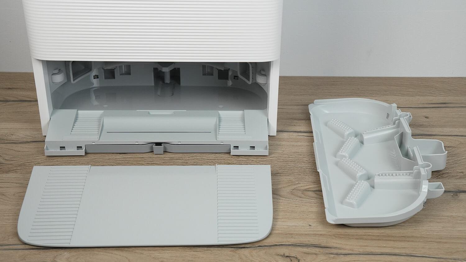 Dabar, kai sutvarkėme robotą, pereikime prie stotelės. Labai patogu, kad galima nuimti ne tik rampą, pro kurią robotas gali patekti, bet ir vidinį padėklą, kuriame plaunamos servetėlės. Tai labai palengvina stotelės valymą.