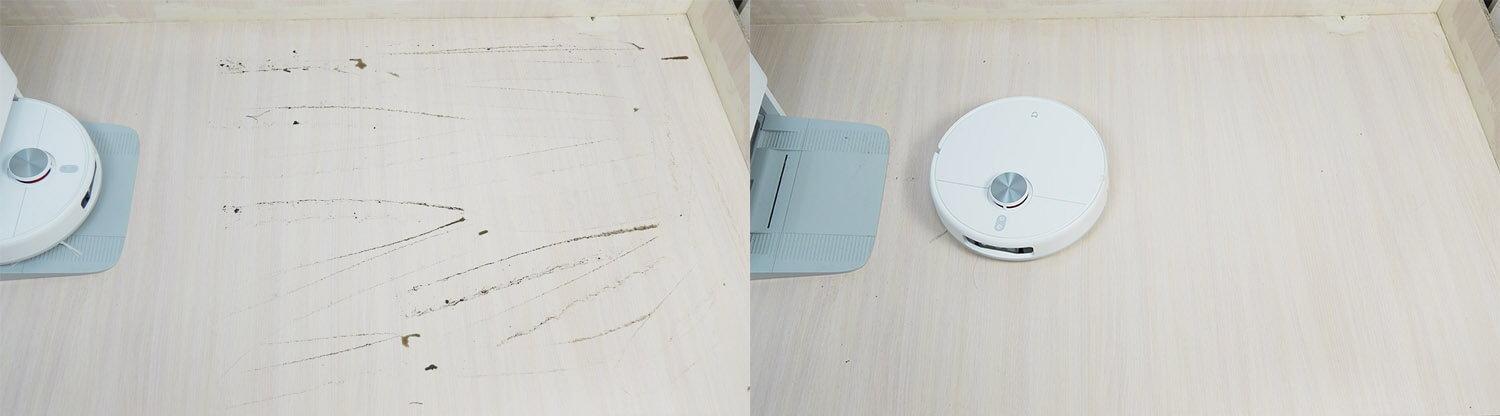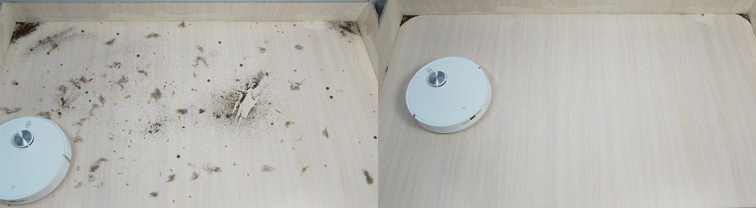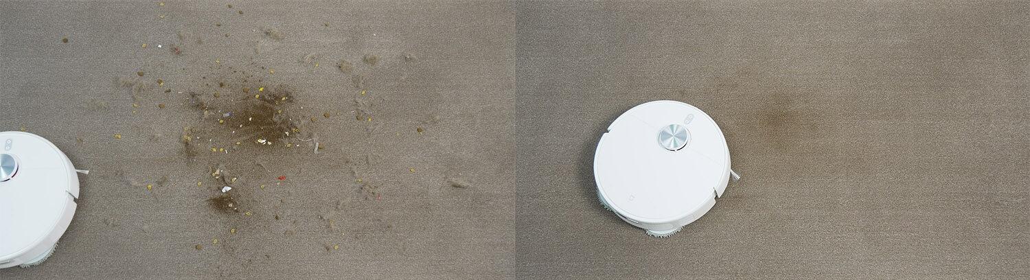 Tačiau įvairių tipų šiukšlių surinkimo našumas nuo laminuotų grindų yra geras. Kampuose, kur negali šluoti apvalūs robotiniai dulkių siurbliai, lieka tik šiek tiek šiukšlių. Centrinis šepetys surenka šiek tiek plaukų ir kailio. Tačiau didžioji dalis šiukšlių surenkama dulkių konteineryje. Bandymas išlaikytas!