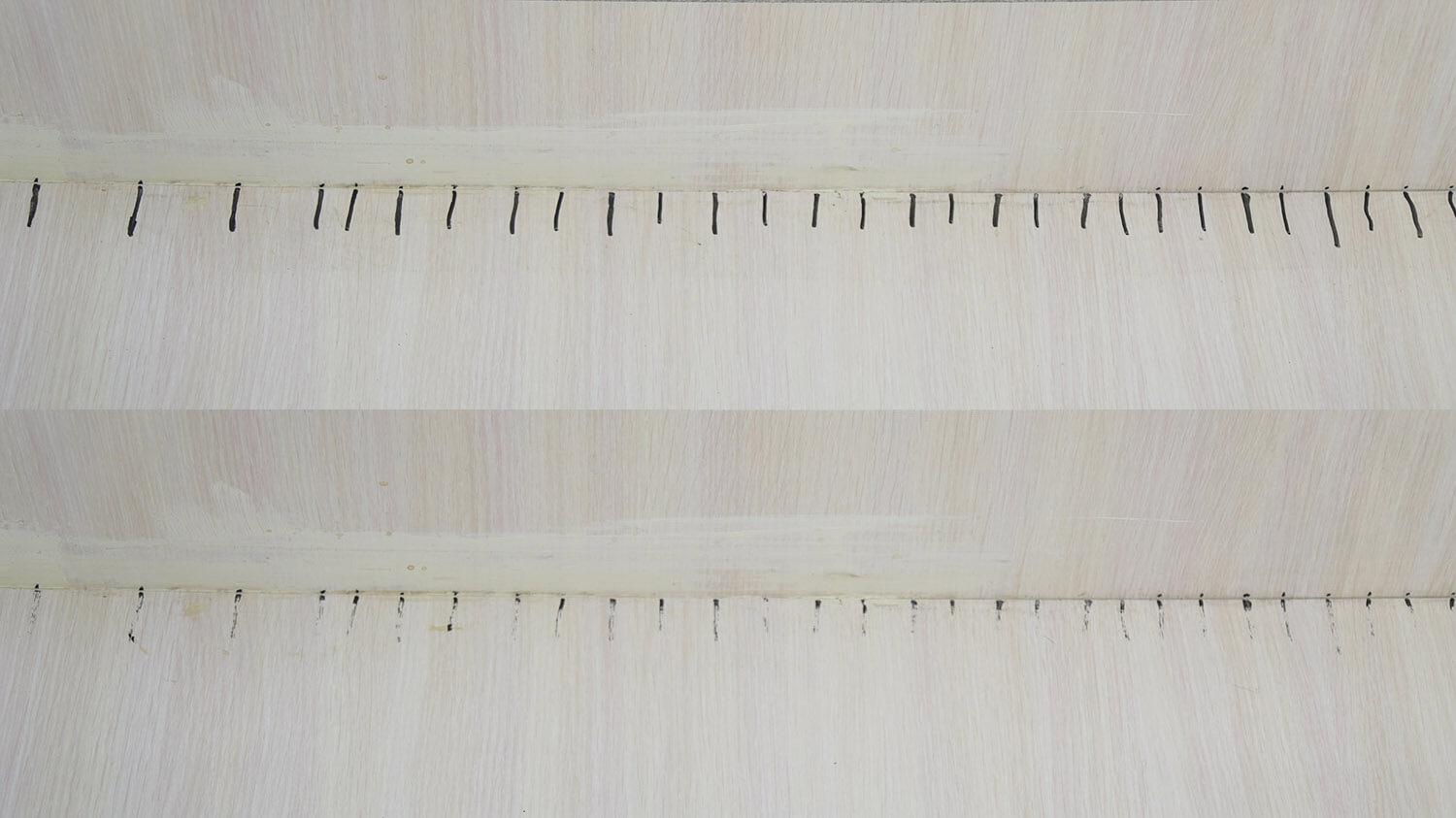 Grindjuosčių valymo funkcijos efektyvumo testas nusipelno ypatingo dėmesio. Matote, kad net ir sukant korpusą tarp ėjimų lieka akloji zona. Todėl grindjuosčių valymas nėra tobulas, bet geresnis nei modeliai be šios funkcijos.