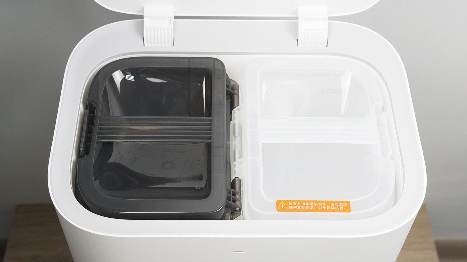 Vandens bakai yra po viršutiniu dangčiu. Jie yra didesnės talpos – kiekvieno jų talpa – 4 litrai. Už bakų matomi kamščiai, kuriuos galima nuimti, norint prijungti kanalizacijos ir vandens tiekimo modulį.
