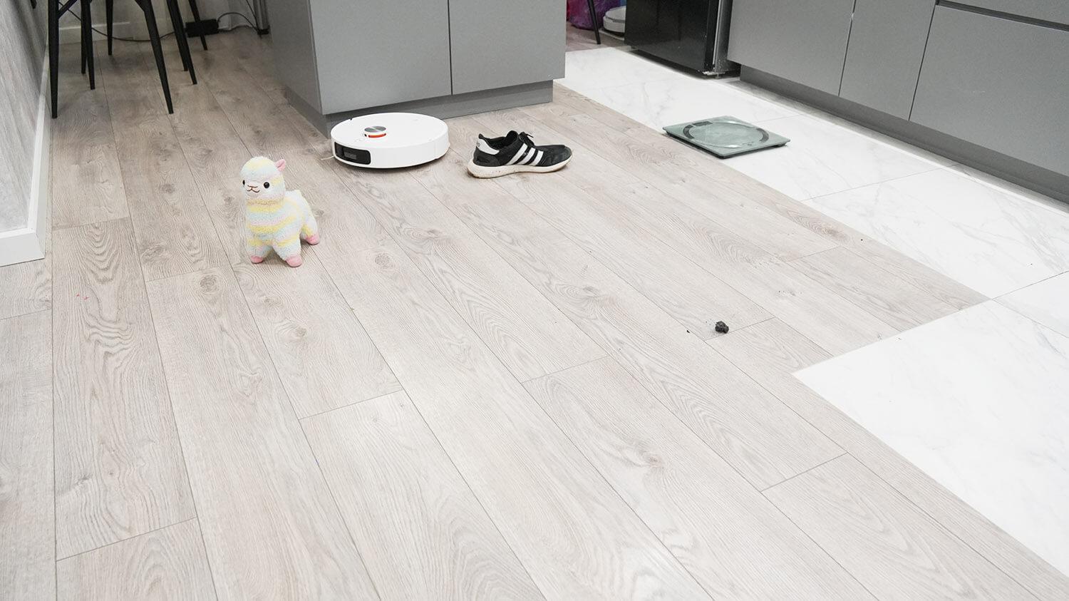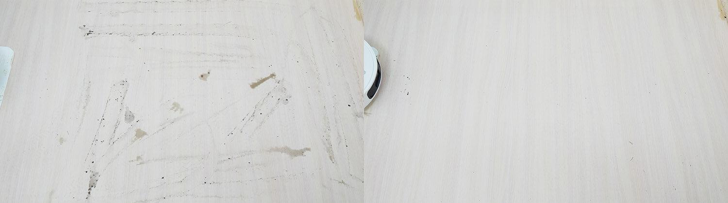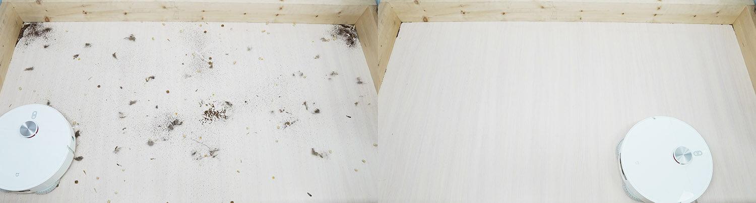 Įvairių tipų šiukšlių surinkimo našumas nuo laminuotų grindų yra geras. Kampuose, kur apvalūs robotiniai dulkių siurbliai negali šluoti, lieka tik nedidelis kiekis šiukšlių. Taip pat svarbu atkreipti dėmesį, kad centrinis šepetys surinko tik minimalų kiekį plaukų ir pūkelių. Taip yra todėl, kad veikimo laikas buvo ribotas dėl didelio šiukšlių kiekio, todėl šepetys tiesiog neturėjo laiko išsivalyti.