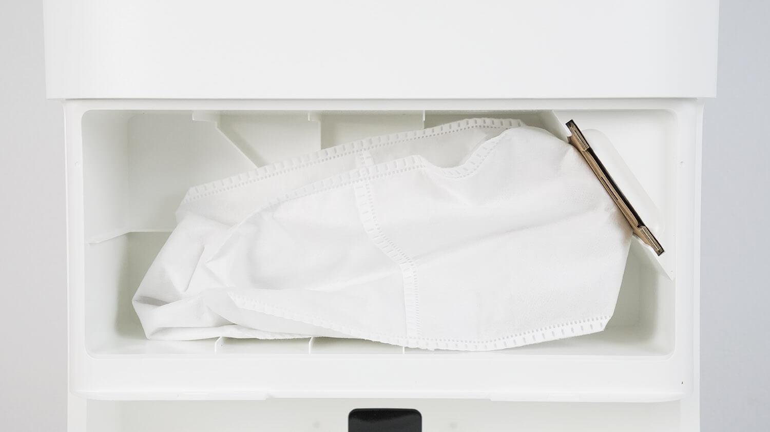 Stotelėje nėra skalbimo priemonės skyriaus. Jį reikės rankiniu būdu įpilti į švaraus vandens baką pagal poreikį. Tačiau modulyje, skirtame prijungti prie kanalizacijos ir vandens tiekimo, yra 900 ml skalbimo priemonės skyrius, kuris automatiškai sumaišomas su vandeniu skalbiant šluostes. Tai privalumas!