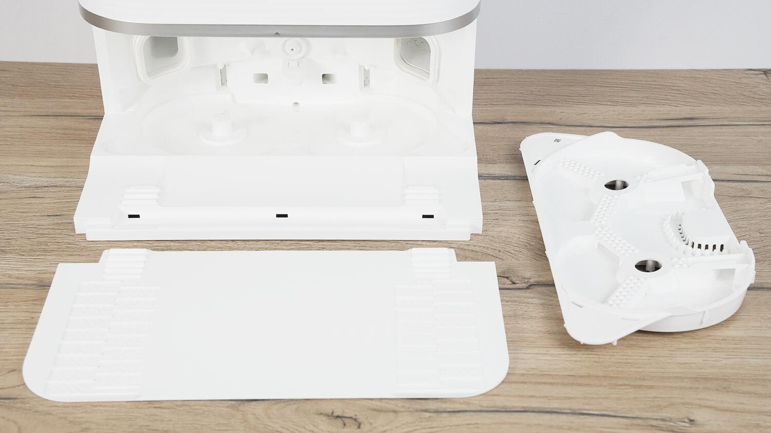 Dulkių surinktuvas yra po viršutiniu dangčiu. Dulkių išleidimo dangtelis nuimtas. Filtravimo sistema yra tik HEPA. Vandens bakas yra paslėptas roboto viduje. Valymo metu vanduo automatiškai pumpuojamas į baką stotelėje ir tiekiamas į valymo pagalvėles.