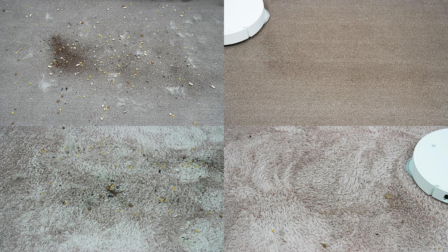 Tos pačios šiukšlės buvo išbarstytos ant trumpo kilimo. Ir galiu pasakyti, kad robotas kruopščiai išvalė kilimą.