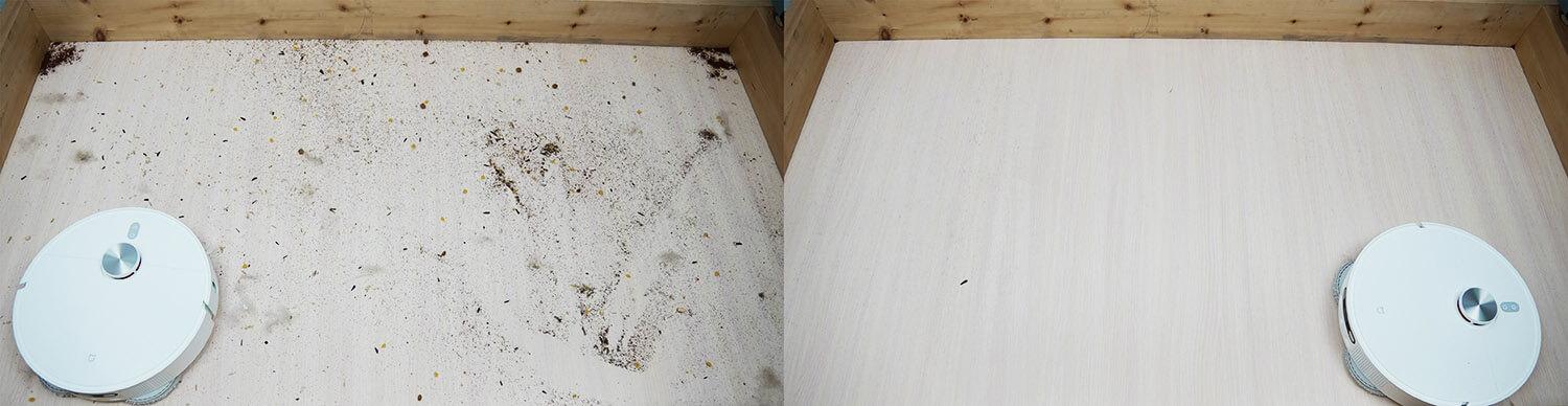 Roboto našumas laminuotose grindyse yra puikus, net ir įvairios tekstūros šiukšlių atveju. Dėl ištraukiamo šoninio šepečio jis išvalo šiukšles net kampuose. Ne mažiau svarbu, kad šoniniai ir centriniai šepečiai yra visiškai švarūs. Turbo šepetys turi šiek tiek plaukų, bet jie nukirpti ir nesusivelia. Testas išlaikytas!