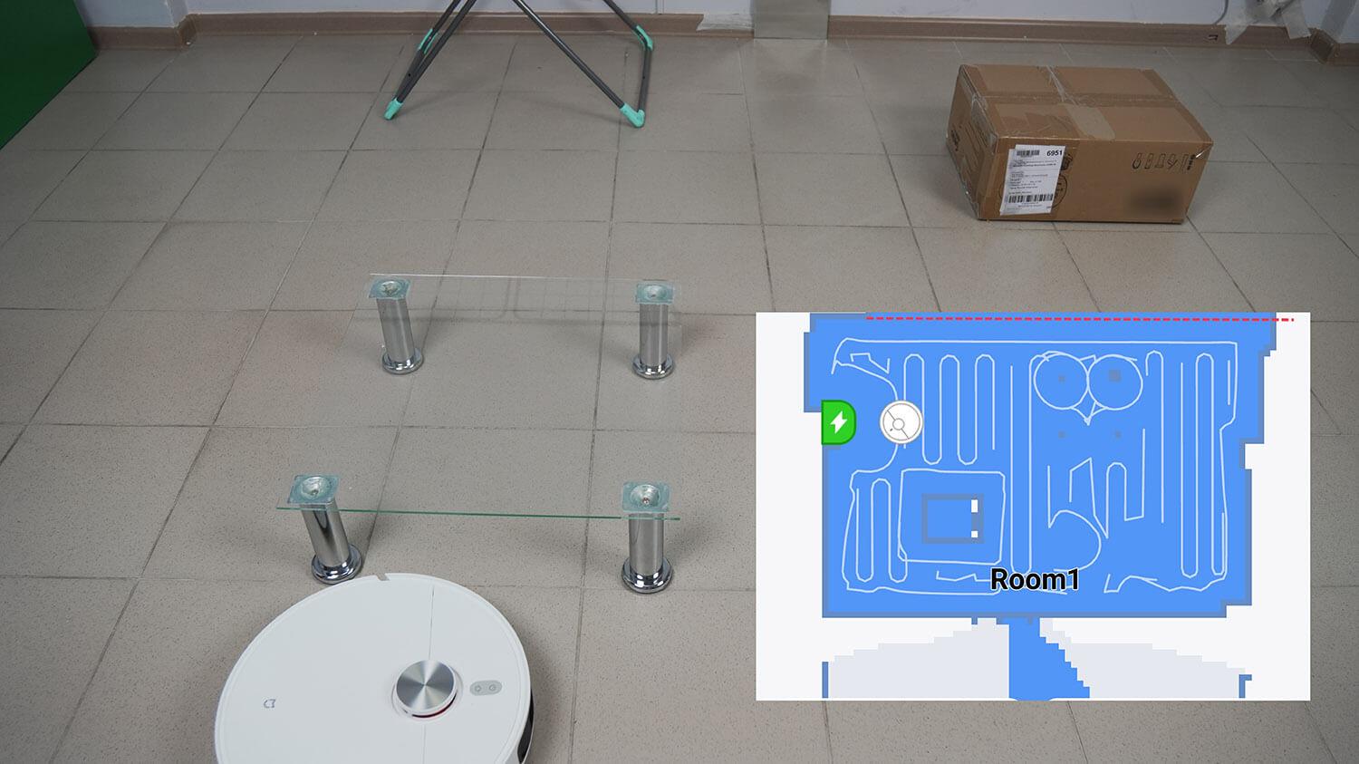 Ir galiausiai, pereikime prie bandymų! Pirmiausia išbandysime „Xiaomi Mijia M40“ navigaciją kambaryje su kliūtimis. Robotas dulkių siurblys pirmiausia juda aplink kambario perimetrą, tada serpantininiu būdu išvalo visą prieinamą plotą. Jis taip pat judėjo virš džiovyklės kojelių. Veidrodis žemėlapyje pridėjo neegzistuojančią zoną, kaip ir kiti lidaro robotai. Robotas taip pat atskirai apvalė dėžę ir chromuotas kojeles, o tada grįžo į stotelę. Nebuvo aptikta jokių neįprastų manevrų, todėl bandymas buvo sėkmingas.