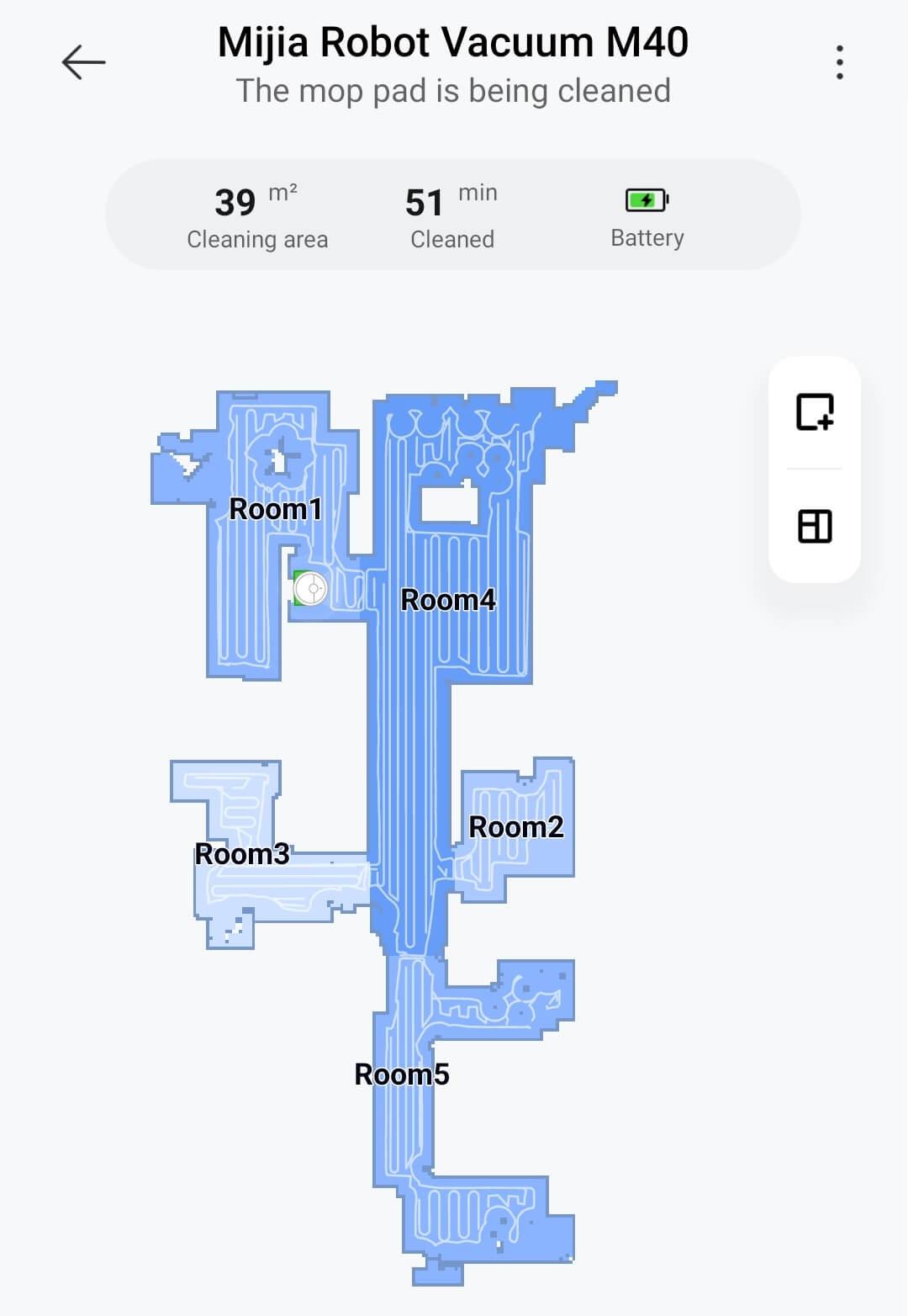 Kalbant apie navigaciją namuose, robotas dulkių siurblys valo kambarį po kambario, sekdamas perimetrą, o tada vingiuotu raštu. Kas 20 kvadratinių metrų, kaip nustatiau, jis grįžta į stotelę ir išplauna servetėles, o tada tęsia valymą nuo ten, kur baigė. Nelieka jokių neišvalytų vietų; šis modelis turi puikią navigaciją!