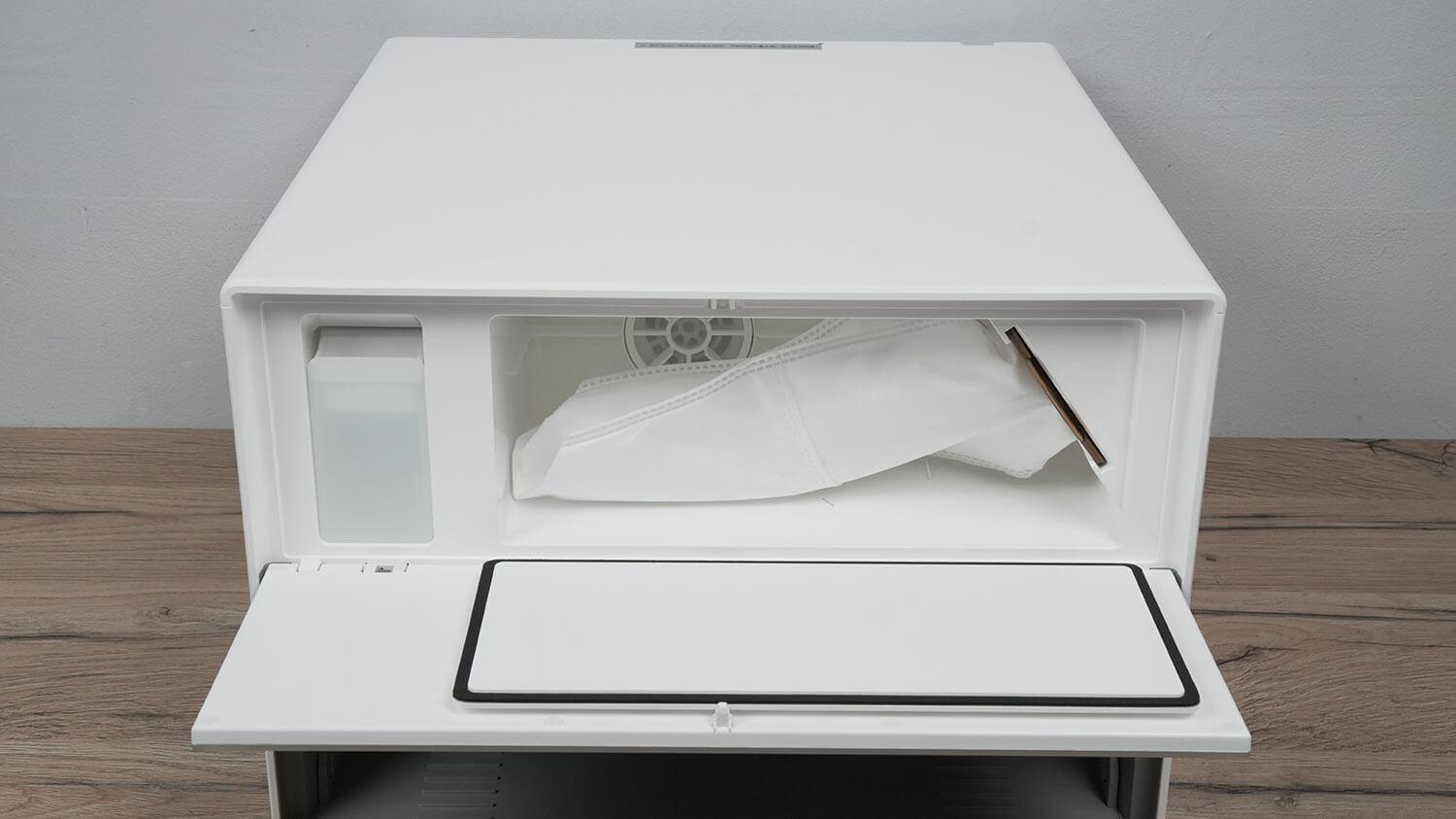 Atliekų maišas ir ploviklio bakas yra po priekiniu dangčiu. Deja, kaip ir įmontuotos stotelės atveju Dreame X50 MasterStotinės vandens įleidimo / išleidimo sistema nėra prieinama. Anksčiau apžvelgtos panašios stotys turėjo prieigą prie tarpinio rezervuaro nešvariam vandeniui, kuriame buvo galima išvalyti sietą nuo kalkių. Šios stoties negalima prižiūrėti rankiniu būdu, ir man tai nepatiko.