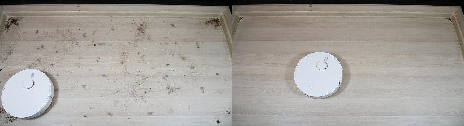 Įvairių tipų šiukšlių surinkimo našumas nuo laminuotų grindų yra geras. Kampuose, kur nepasiekia apvalūs robotiniai dulkių siurbliai, lieka tik nedidelis kiekis šiukšlių. Centrinis šepetys sugavo šiek tiek plaukų ir kailio. Tačiau didžioji dalis šiukšlių buvo surinkta dulkių konteineryje. Testas išlaikytas!